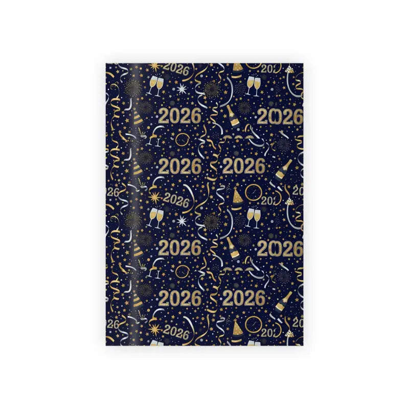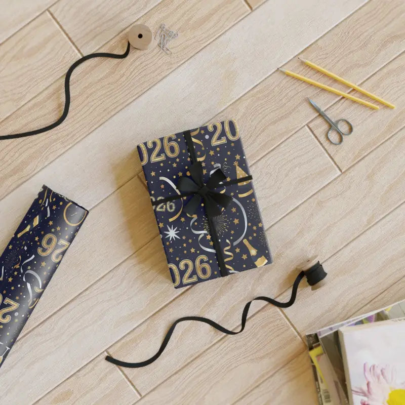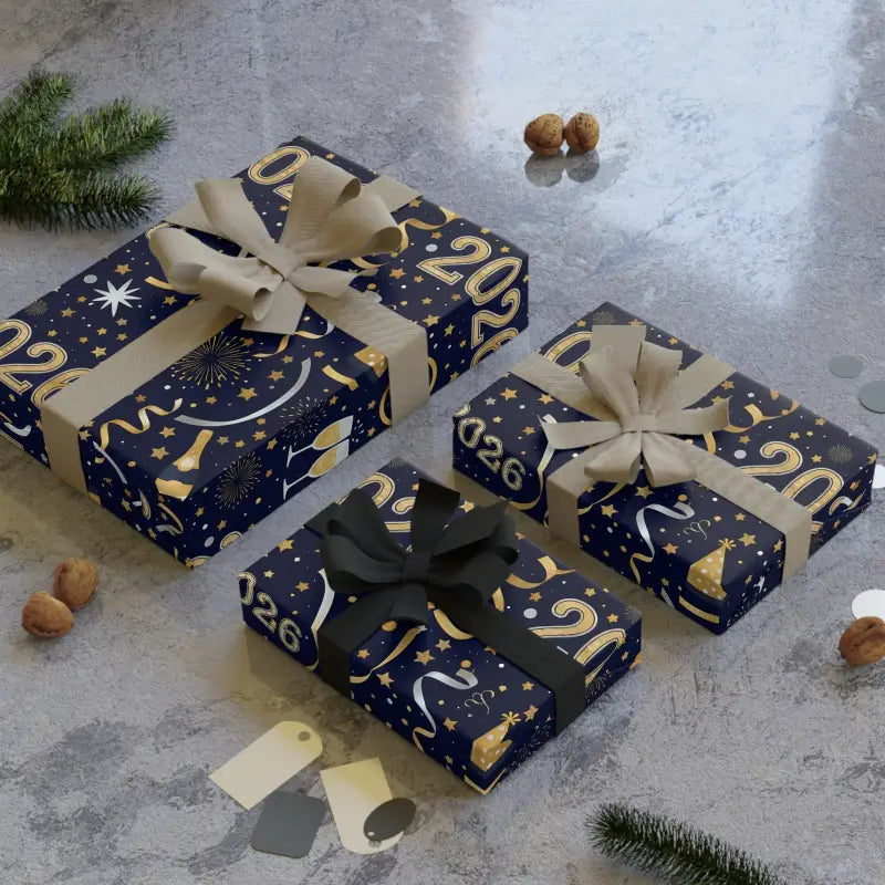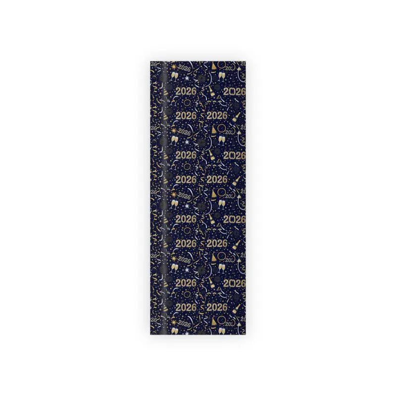Dress your presents in deep midnight blue streaked with metallic-gold champagne flutes, dancing confetti, twinkling stars, and bold 2026 numerals. The satin finish adds a silky touch you can almost hear whisper delight with every crease, layering perfectly under ribbons and tags for grown-up glam.