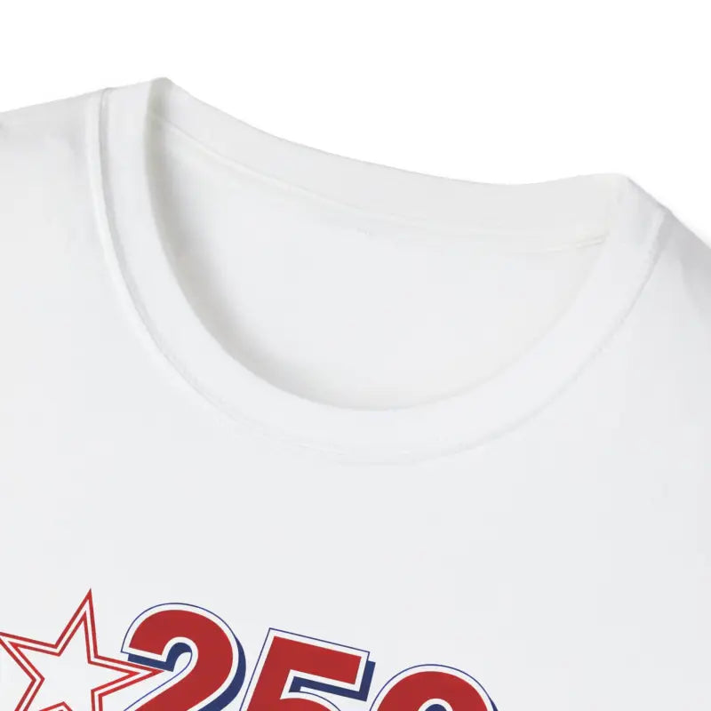 This anniversary tee showcases a crisp white canvas featuring a centered 250 graphic with star accents and the inspiring years of independence text below. The design strikes the perfect balance between celebration and subtlety, making it your go-to choice for commemorative gatherings and casual weekends alike.