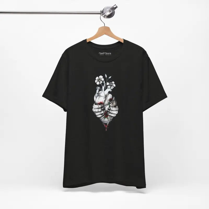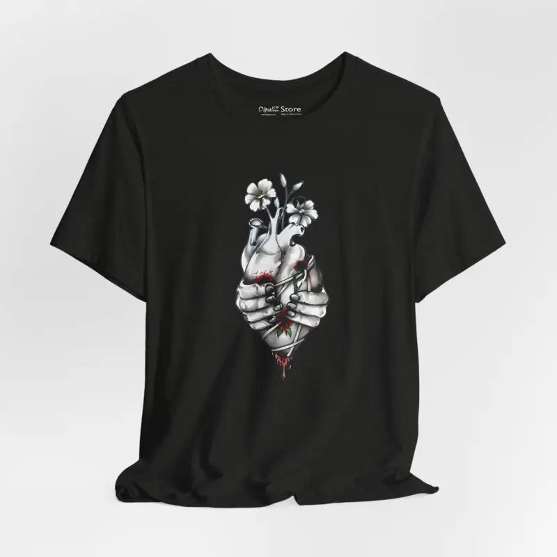This classic unisex jersey short sleeve A bandaged heart with flowers and blood dripping tee fits like a well-loved favorite. Soft cotton and quality print make users fall in love with it over and over again. These t-shirts have-ribbed knit collars to bolster shaping. The shoulders are tapered for a better fit over time. Dual side seams hold the garment's shape for longer.