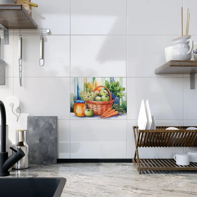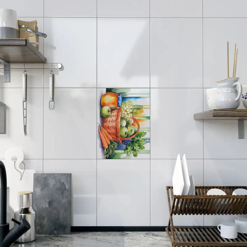 - Captivating ceramic photo tile featuring a rich fruit veggie ceramic design that instantly enlivens kitchens, living rooms, and bathrooms.