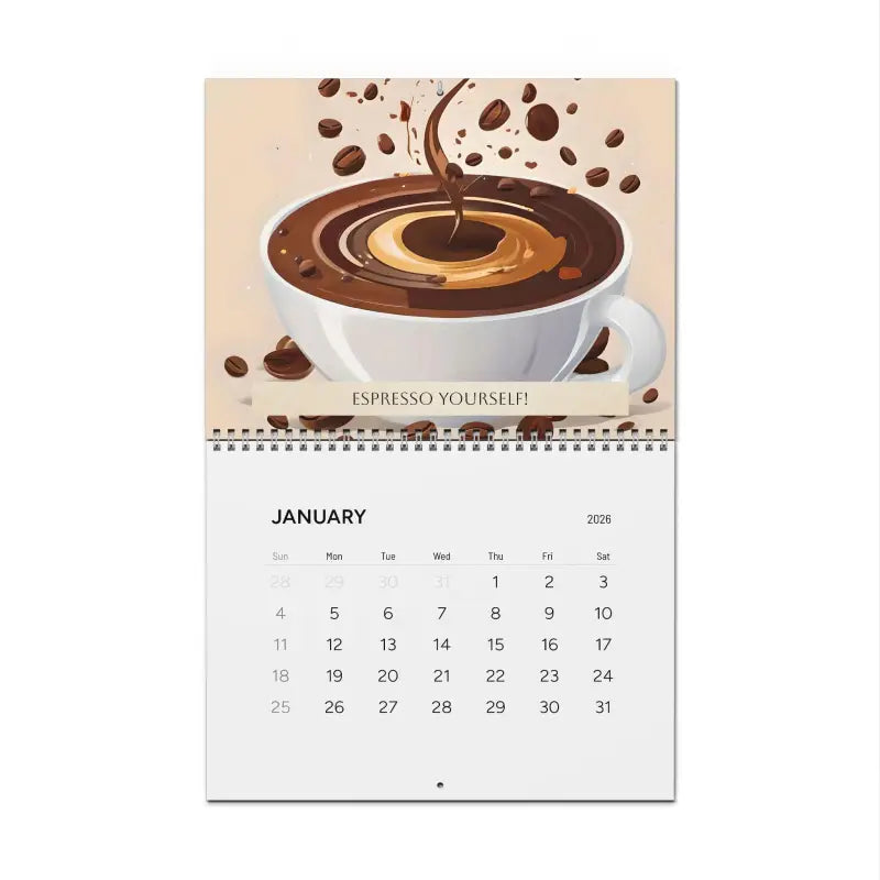 A coffee mug with quirky coffee quotes each month, Calendar (2026)