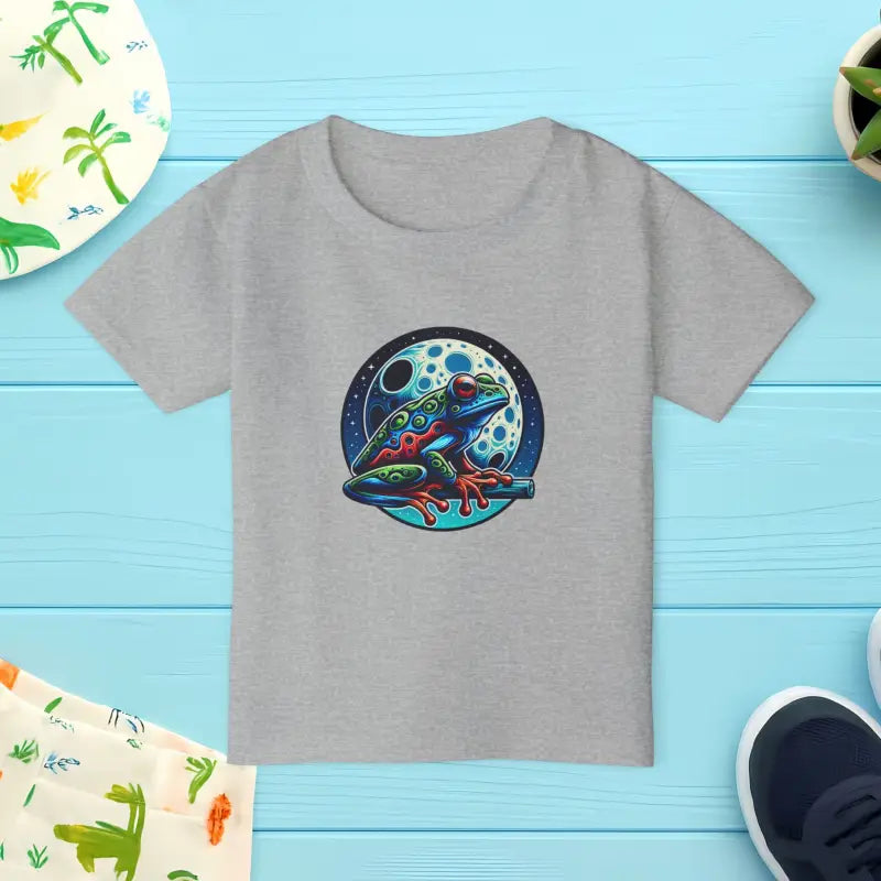 A frog with a moon, Toddler T-shirt. Equipped with a classic fit that is universally comfy, these cute toddler tees feature high stitch density for a smoother printing surface. Meanwhile, their 3/4" double-needle topstitched collar, along with the double-needle sleeve and bottom hems make for enhanced garment durability.