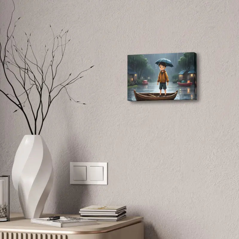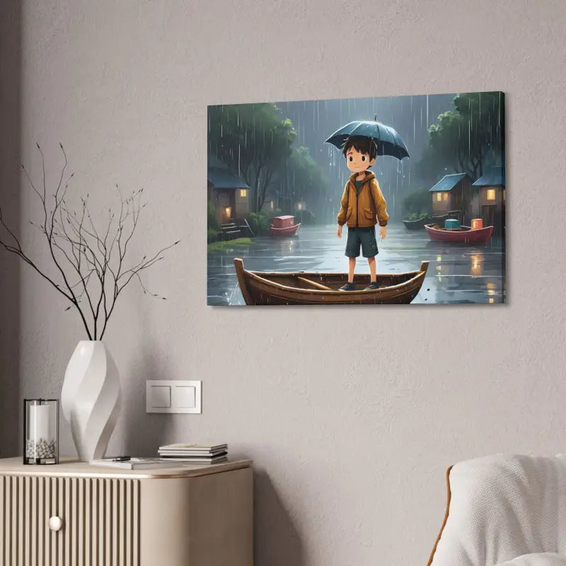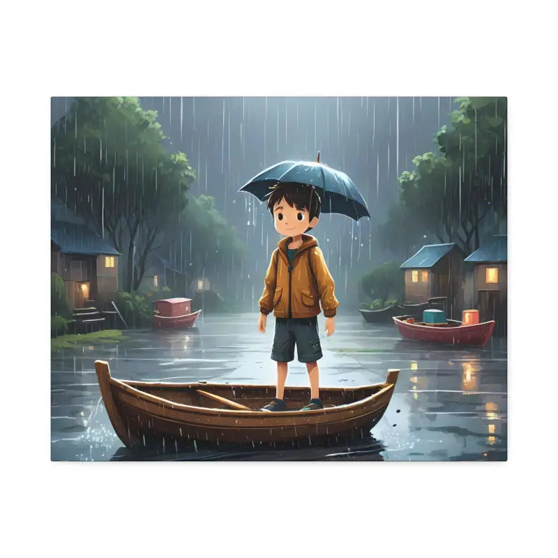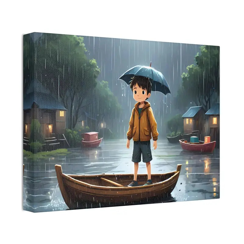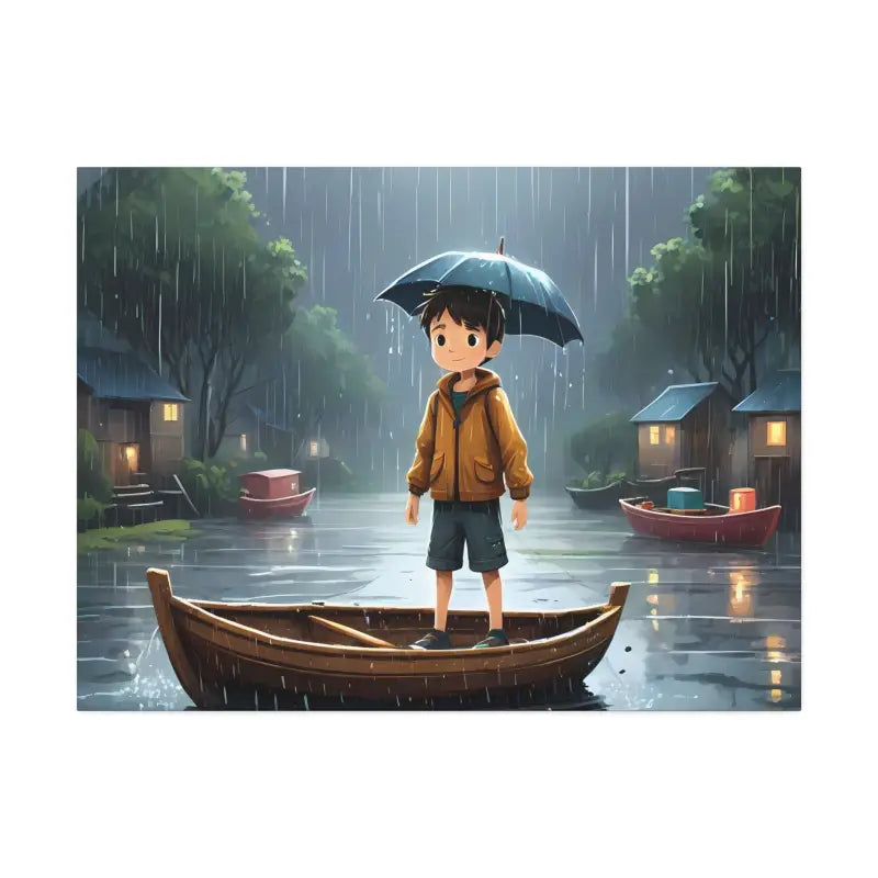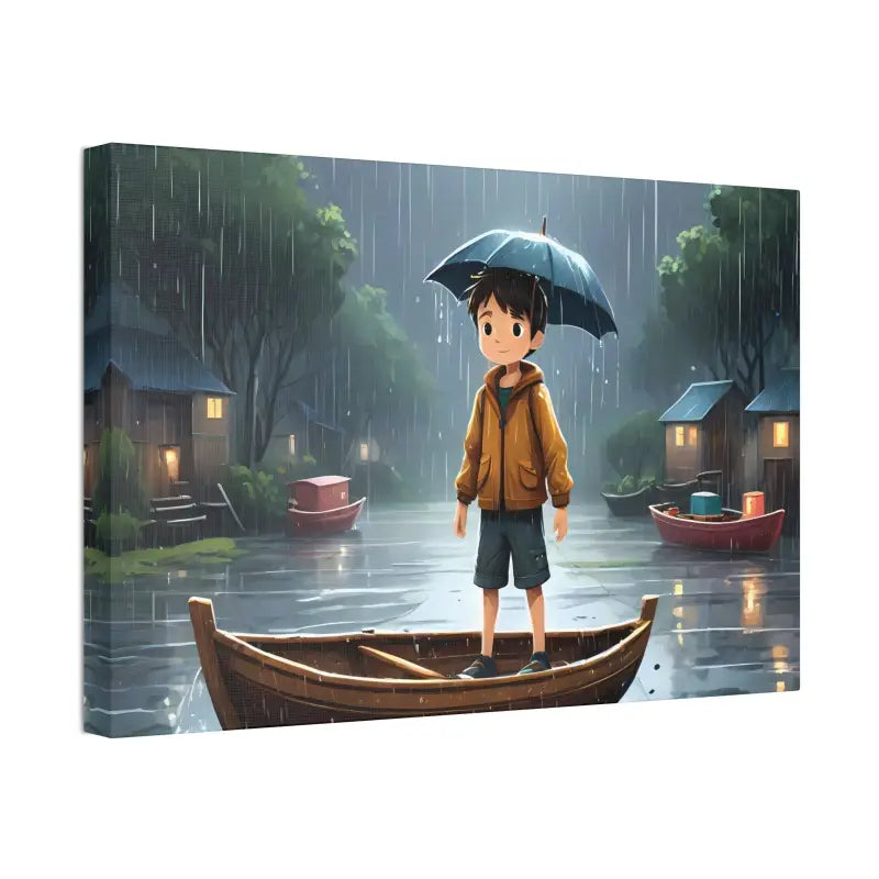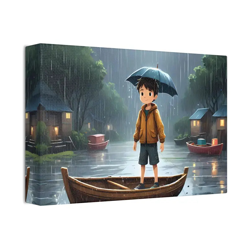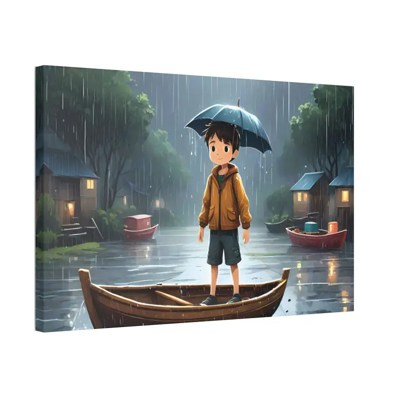 A boy with an umbrella hat on a boat in rain, Semi glossy finish, Canvas Stretched, 1.5''. Treat your fans and audience to a stretched canvas print of your taste that they'll love. Made with hand-stretched fabric on a wooden frame, these prints are extremely durable with a long-lasting semi-glossy finish. Your art decorates the print in vivid detail and stunning colors.