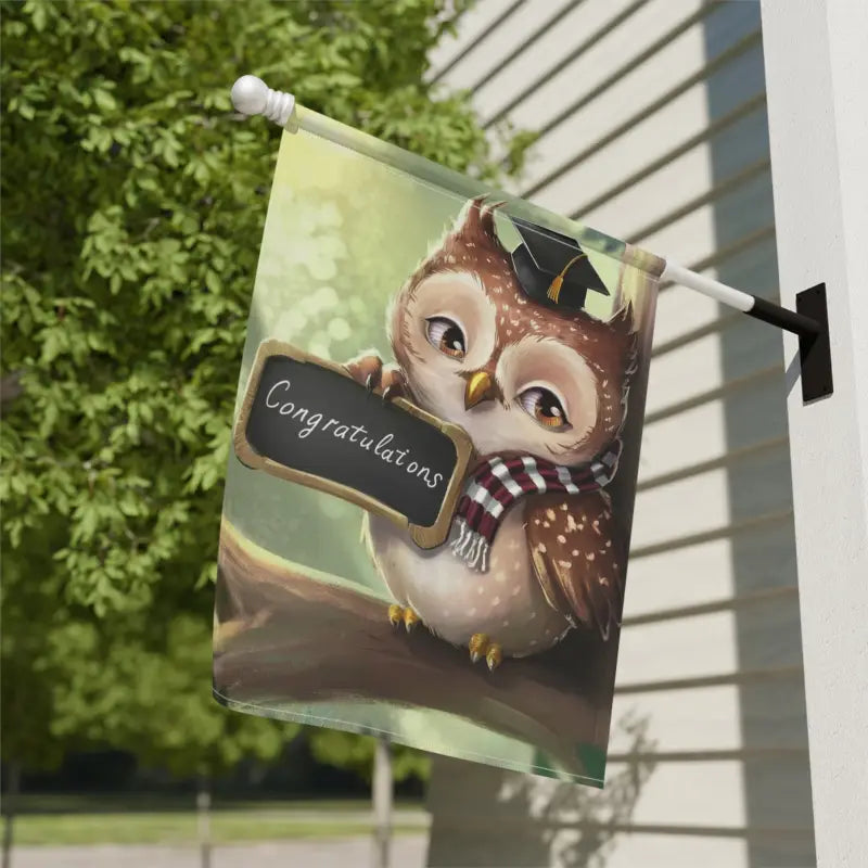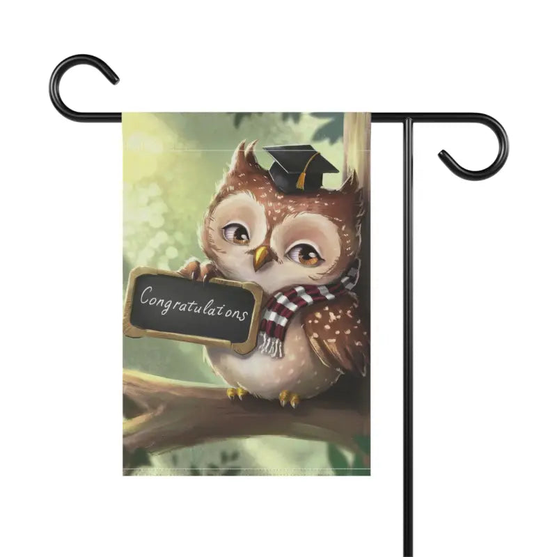 Transform your home and garden into a festive, joyful haven with the Congrats Garden Banner featuring an adorable Graduating Owl. This house banner is the perfect way to show off your celebratory spirit with charm and style. Crafted from durable poly poplin-canvas fabric, this banner stands up to the elements while showcasing vibrant, crisp designs on both sides. Available in two versatile sizes (12'' × 18'' and 24.5'' × 32''), it's designed to fit seamlessly into any setting, whether it’s on your porch or amongst your garden blooms. The convenient top sleeve ensures easy placement on poles, making setup a breeze!