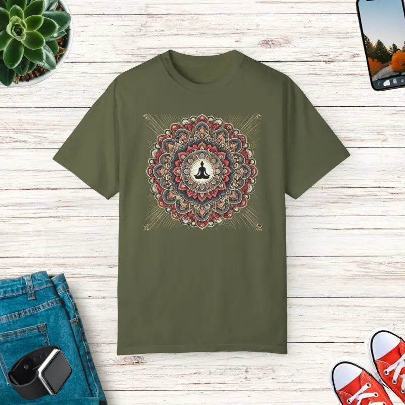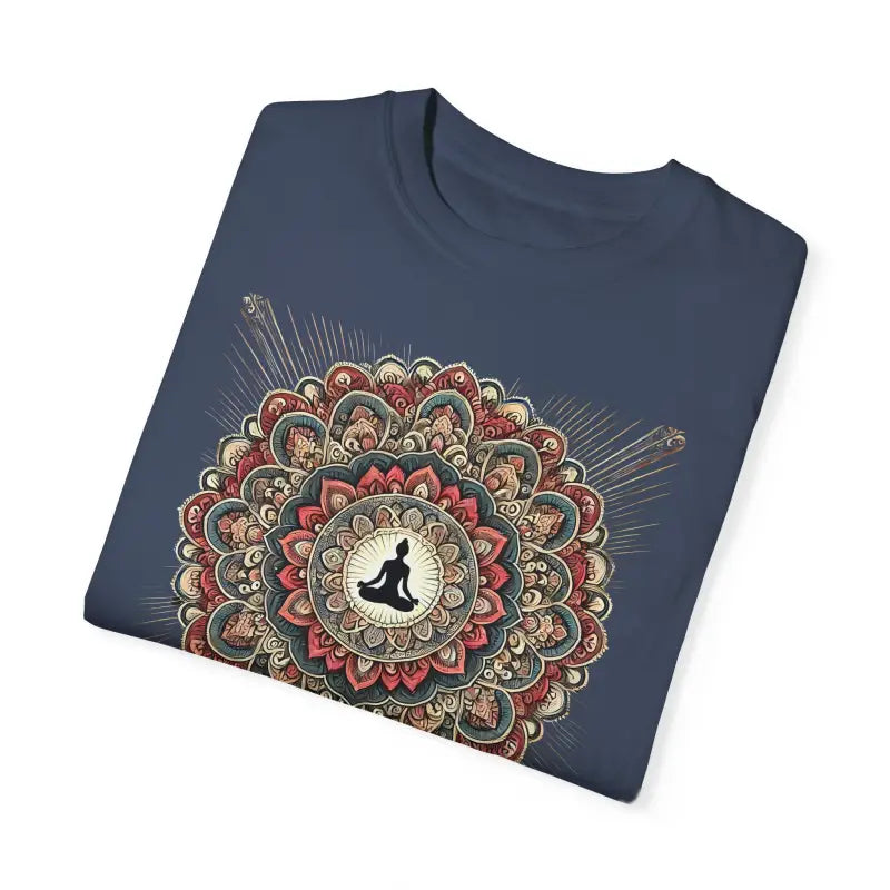 Print: Eye-catching design featuring a person meditating inside a detailed mandala for a serene, zen-inspired style.