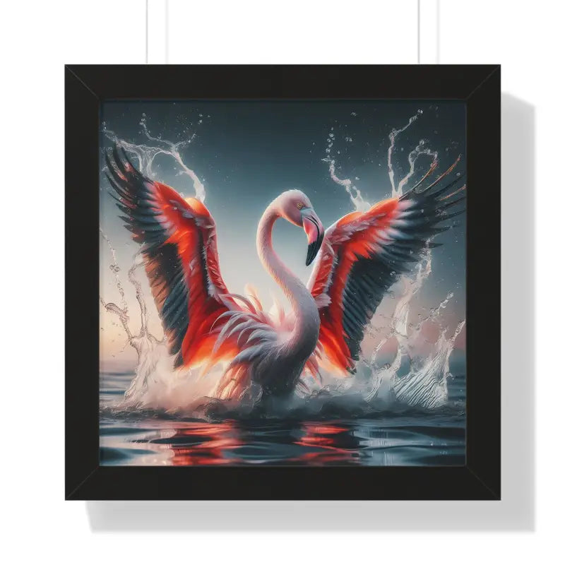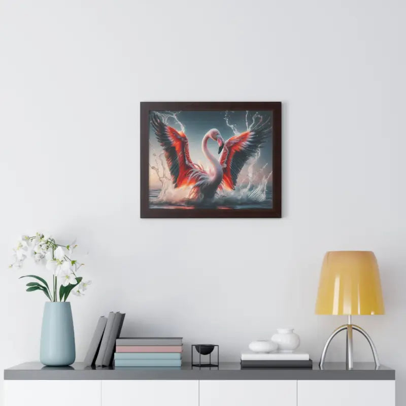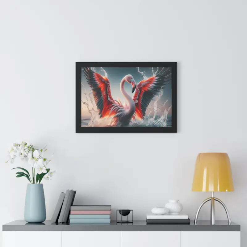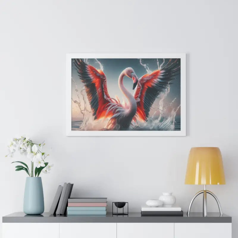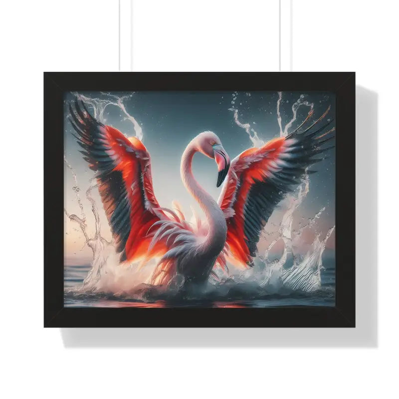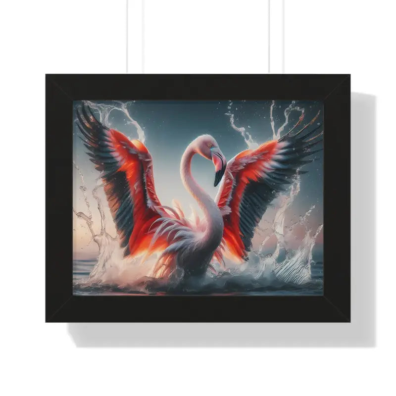 A Pink Flamingo splashing in water, Framed Horizontal Poster