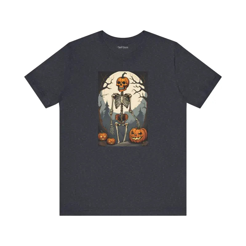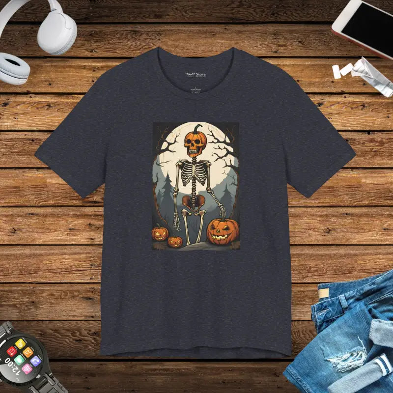 Step into the Halloween spirit with a bewitching blend of comfy and cool in this unisex jersey short sleeve tee featuring a playful skeleton with a Jack o' lantern. This masterpiece of style delivers an everlasting appeal with its super-soft cotton that feels like a gentle hug, making it your go-to pick for any festive occasion. With premium printing, each design detail pops, ensuring you’ll look hauntingly fantastic. The ribbed knit collars add that dash of structure, while the taped shoulders ensure your perfect fit stays just as magical wash after wash. Plus, those dual side seams? They work their charm to keep the shape of your favorite garment looking fresh and crisp.