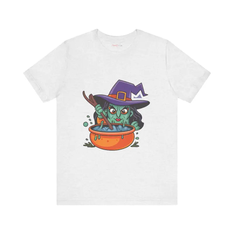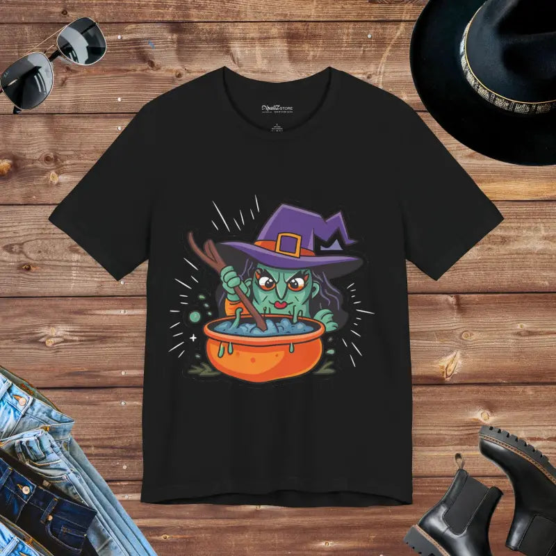 Print: A captivating short sleeve witch featuring a whimsical potion brewing scene designed to ignite your imagination and spice up your wardrobe.