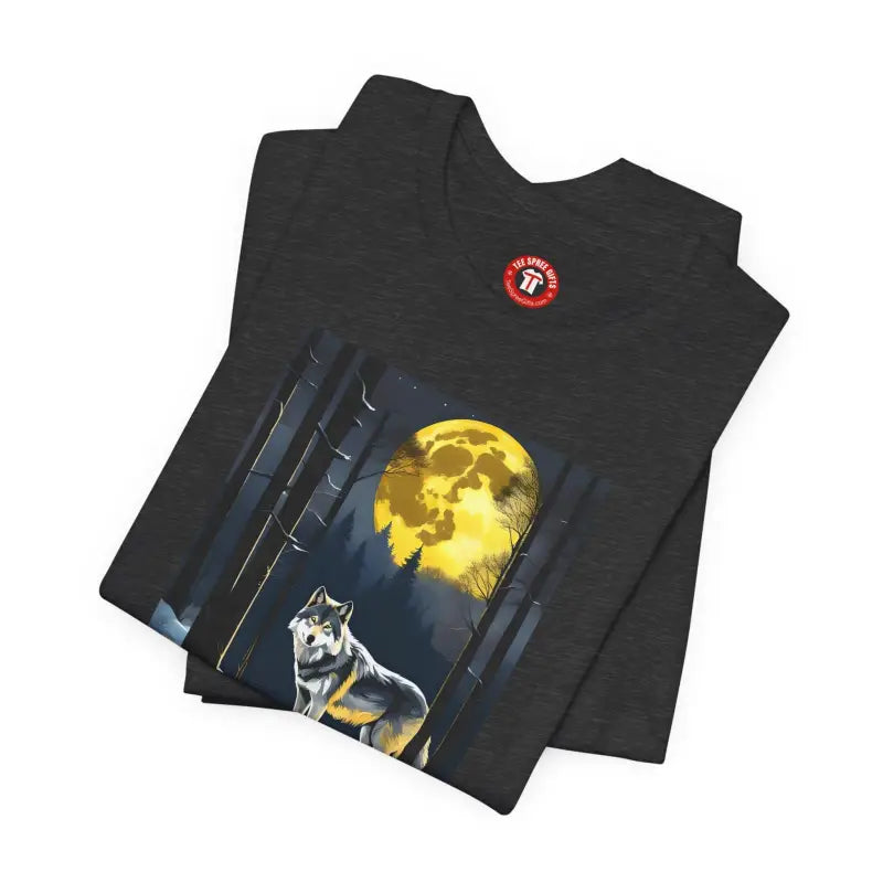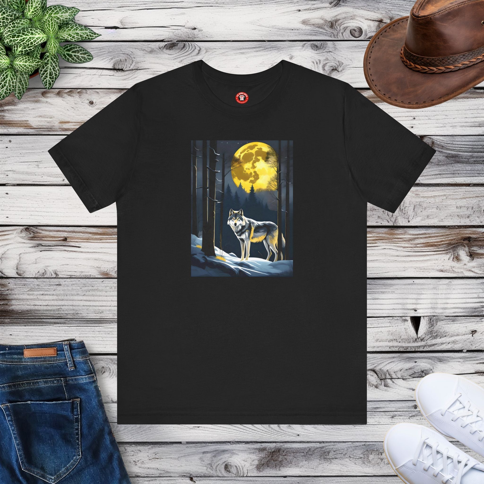 A wolf in a moonlit forest with a full moon, Unisex Jersey Short Sleeve Tee. This timeless unisex jersey short sleeve t-shirt offers a familiar and cherished feel. Its gentle cotton and premium print create an enduring affection among wearers. These shirts feature ribbed knit collars for enhanced structure and taped shoulders for lasting fit. The dual side seams further preserve the garment's form.