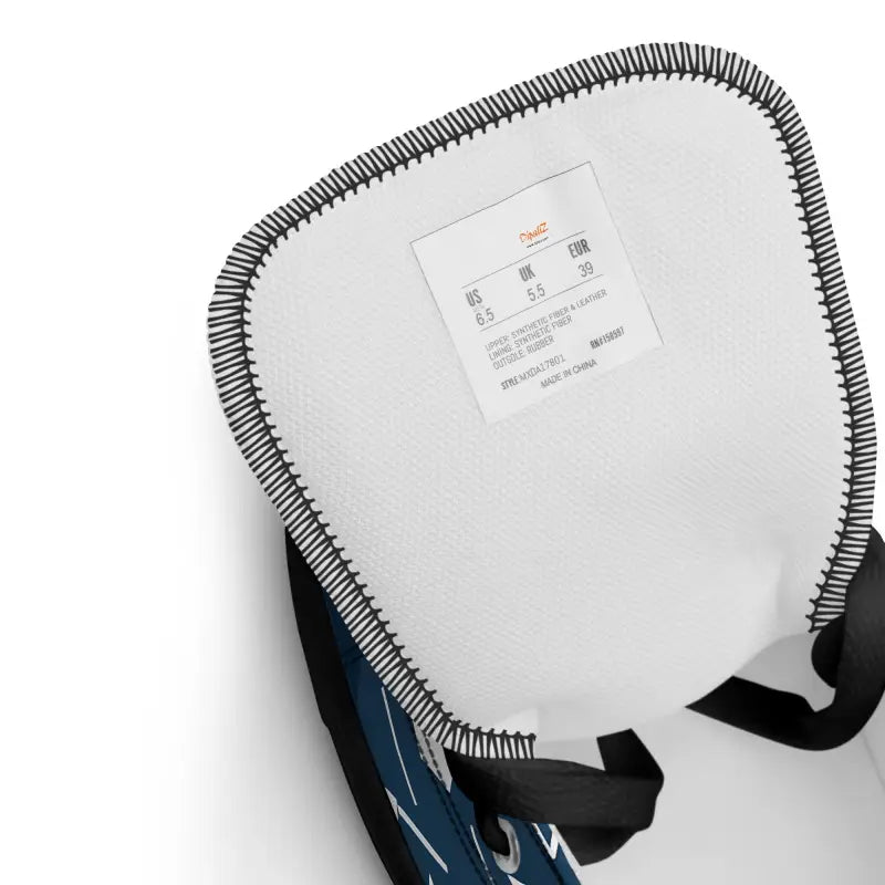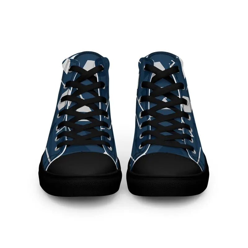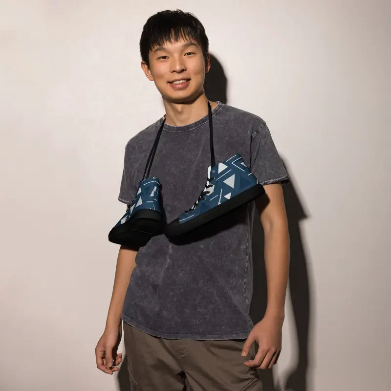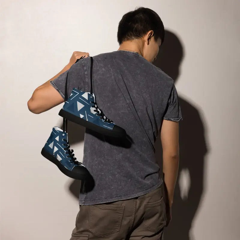 The cool color blend of deep navy blues, vibrant sky tones, and clean whites creates an eye-catching contrast that turns heads. Triangles geometric pattern adds a modern edge, making these high tops an instant conversation starter whether you’re grabbing coffee or exploring the city.