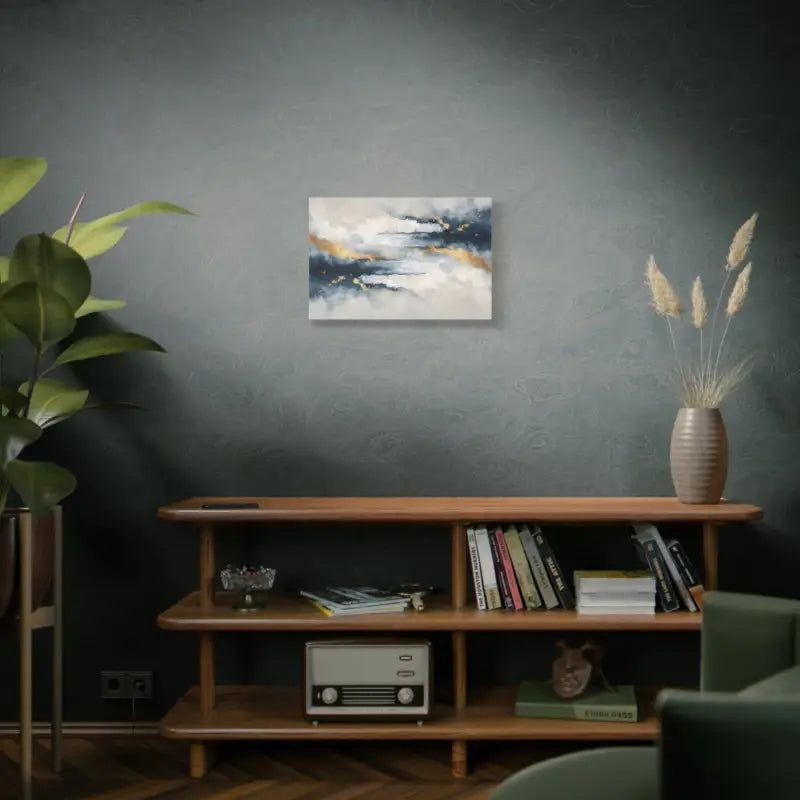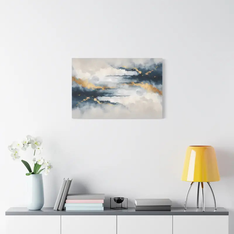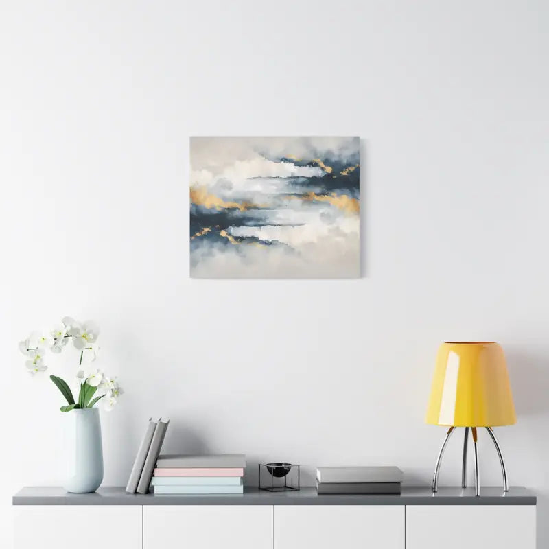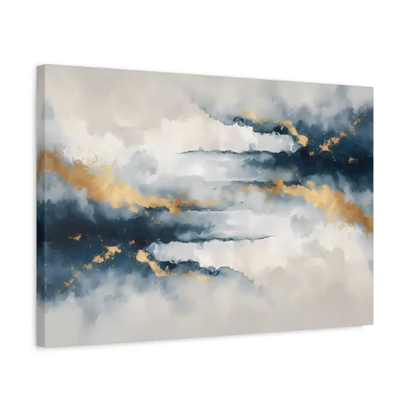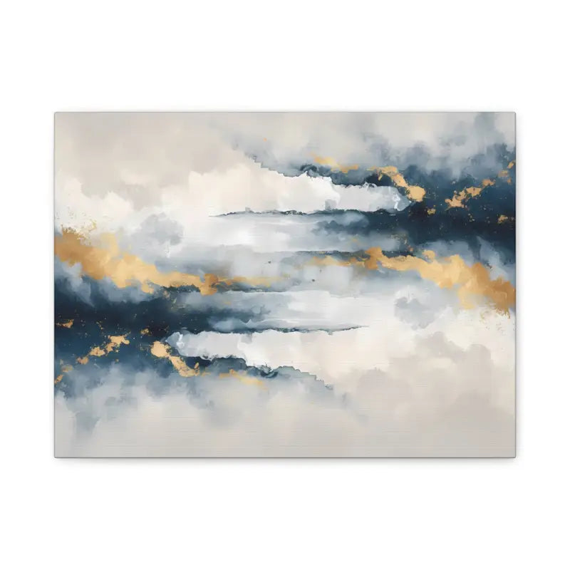 Soft coastal clouds drift across a deep navy sky, brushed with gold that glows like sunset light. This matte canvas turns any wall into a calm escape, where every glance feels like a breath of sea air and a moment of quiet stillness.