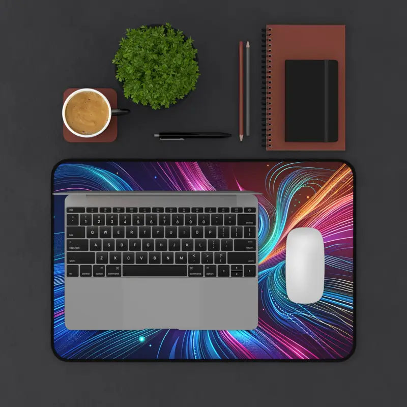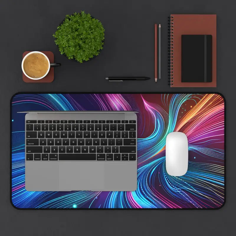 Print: Artistic bursts of neon waves ripple across the surface with dynamic color and fluid movement—making every workspace uniquely captivating.
