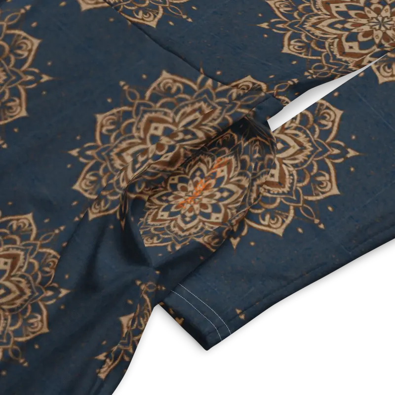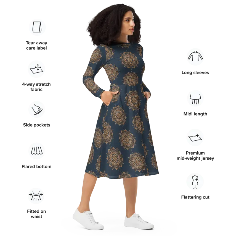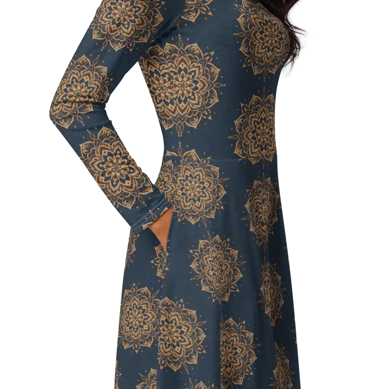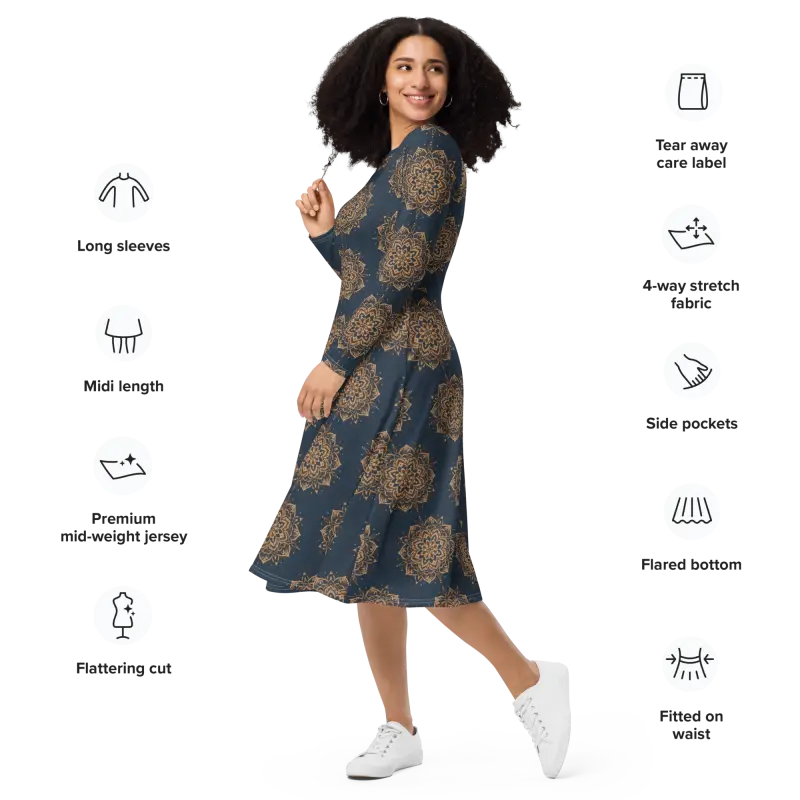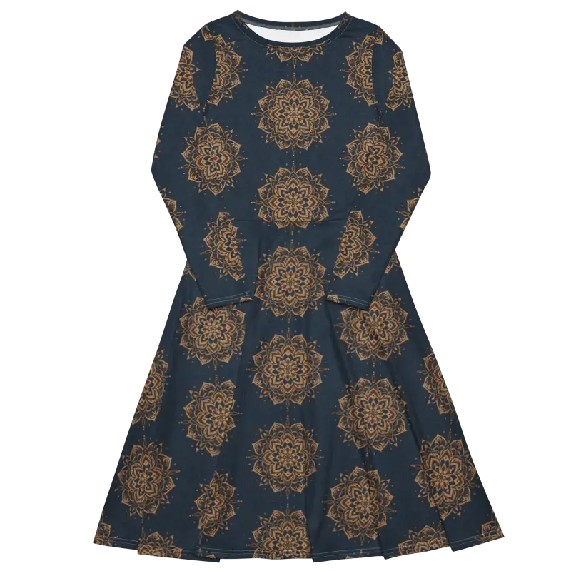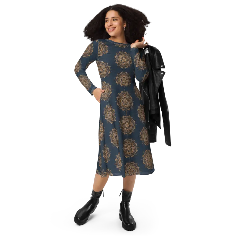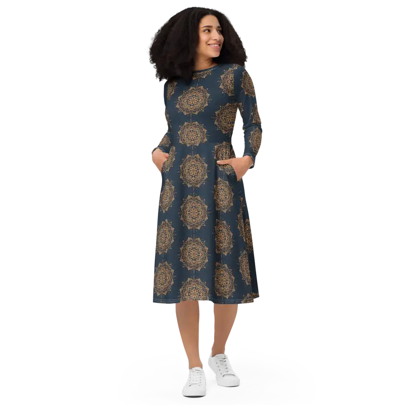 Bold mandala design in crisp white gracefully swirls on deep navy, creating a visual masterpiece that elevates your long sleeve midi look.