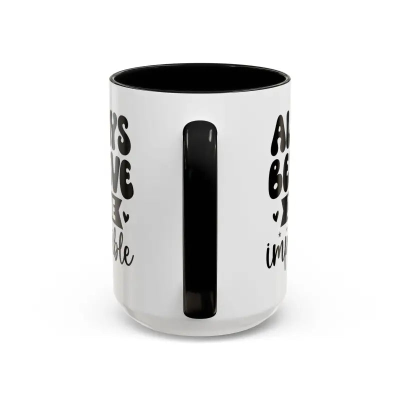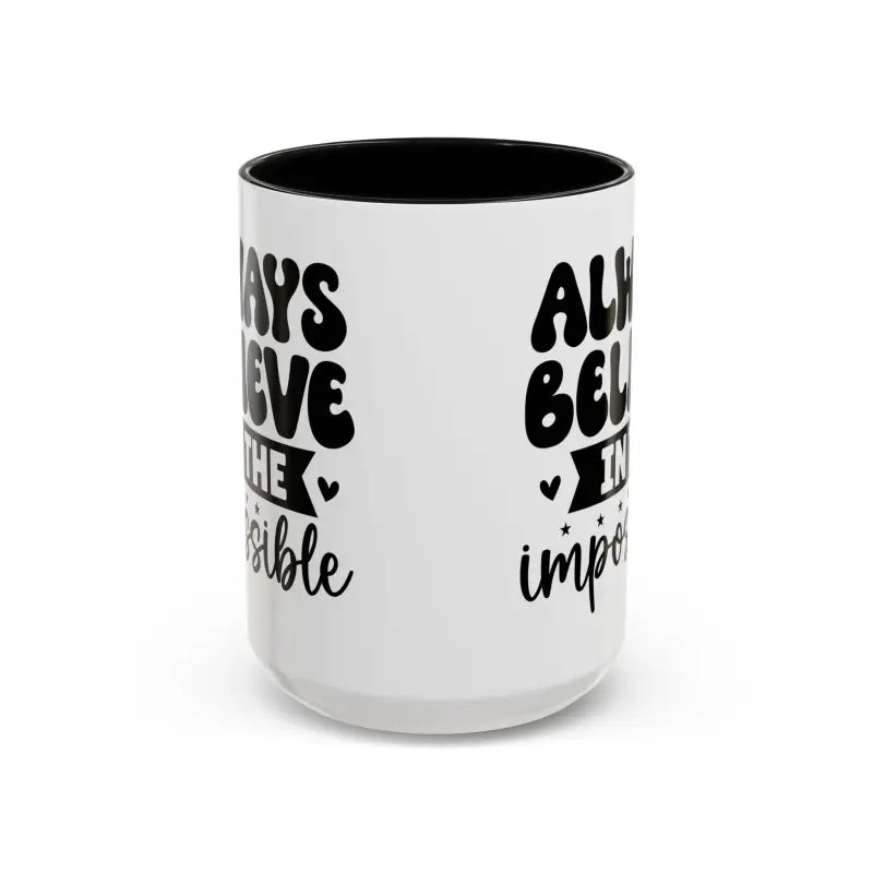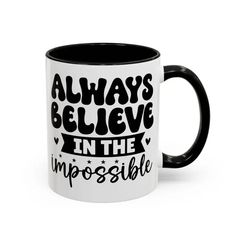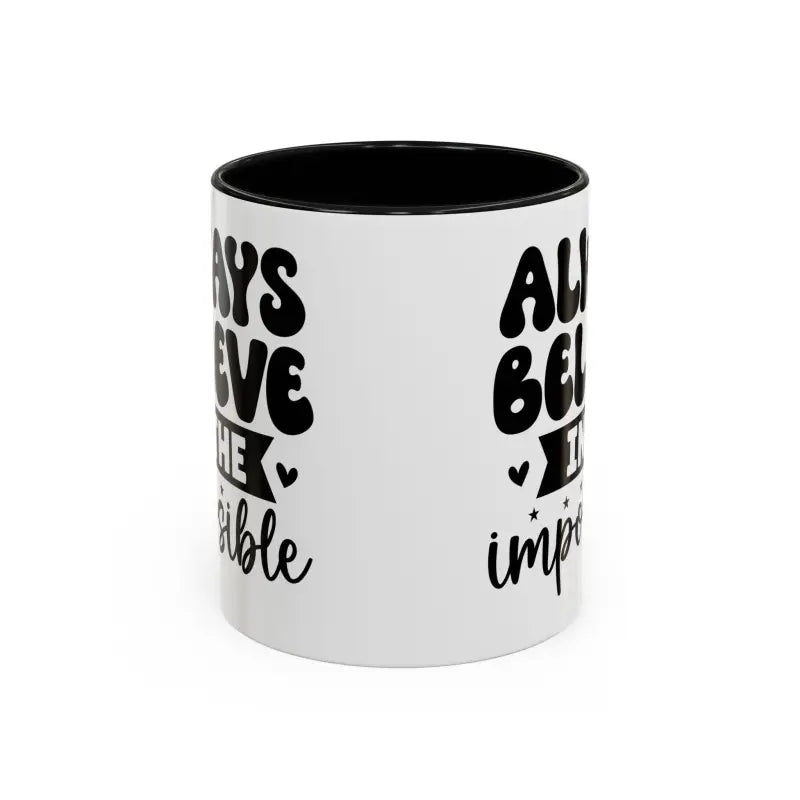 Always believe in the impossible, Accent Coffee Mug (11, 15oz). Meet your next favorite morning companion, the accented ceramic mug. This mug brings the perfect blend of style and functionality to elevate your coffee or tea ritual. Available in two generous sizes, 11oz (0.33 l) and 15oz (0.44 l), this mug offers ample space for your favorite brew. Made with white ceramic and sporting a sleek glossy finish with eye-catching contrast, this mug is a bliss both to use and to look at. The ergonomic C-shaped handle provides a comfortable grip, while the lead and BPA-free construction guarantee peace of mind with every sip.