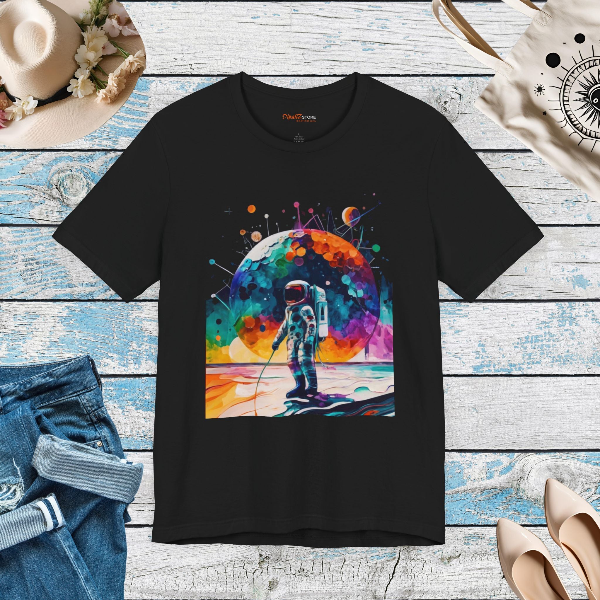 An astronaut in a vibrant background, Unisex Jersey Short Sleeve Tee. This timeless unisex jersey short sleeve t-shirt offers a familiar and cherished feel. Its gentle cotton and premium print create an enduring affection among wearers. These shirts feature ribbed knit collars for enhanced structure and taped shoulders for lasting fit. The dual side seams further preserve the garment's form.