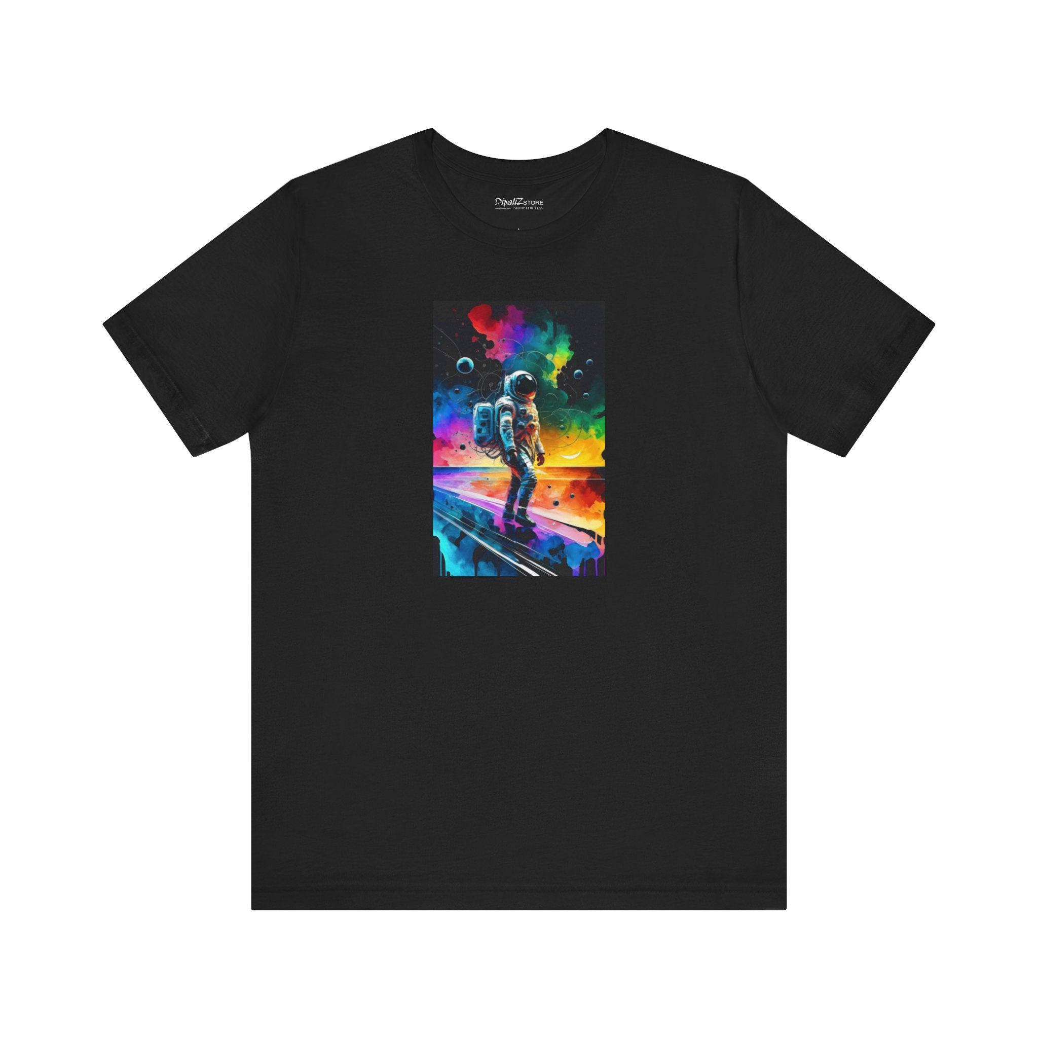 An astronaut in a vibrant background, Unisex Jersey Short Sleeve Tee. This timeless unisex jersey short sleeve t-shirt offers a familiar and cherished feel. Its gentle cotton and premium print create an enduring affection among wearers. These shirts feature ribbed knit collars for enhanced structure and taped shoulders for lasting fit. The dual side seams further preserve the garment's form.
