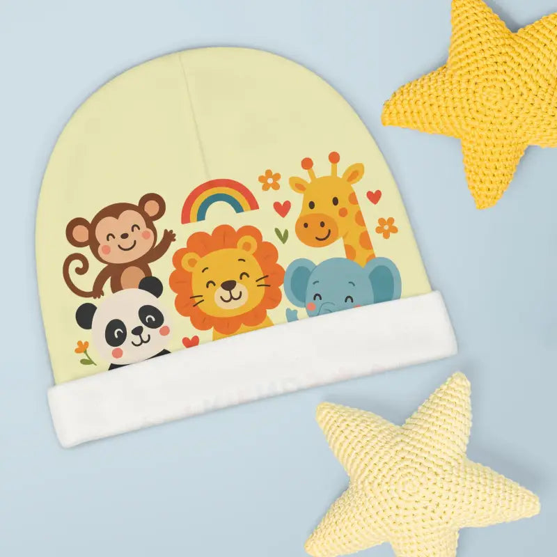 Get ready for cuteness overload with this adorable animal friends baby beanie that turns every outing into a mini safari adventure! Your little explorer will love wearing this cute safari animal hat featuring a cheerful crew of jungle pals including a smiling lion, playful monkey, gentle elephant, and sunny giraffe all dancing above tiny flowers and a rainbow.