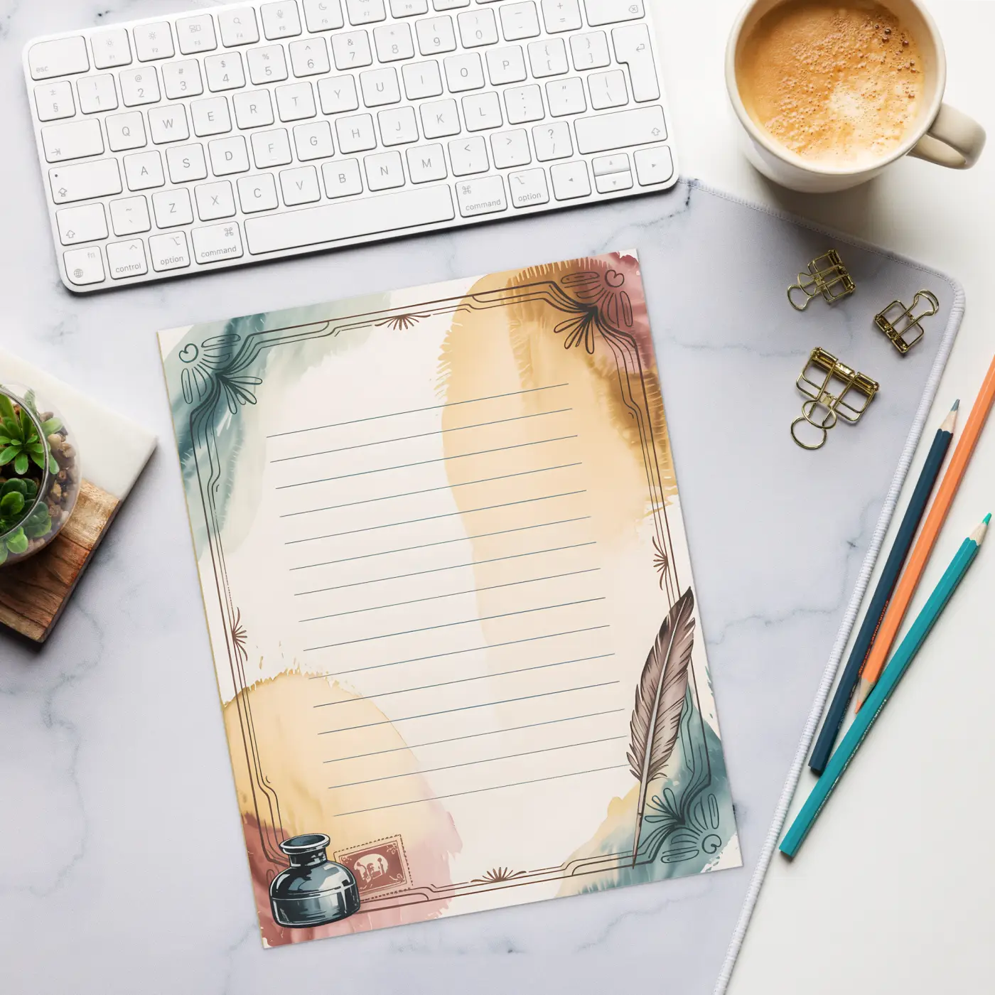 Antique Quill Notepad | Watercolor Ink & Feather Design | Magnetic Back | 50 Lined Pages | 8.76x11.65"
