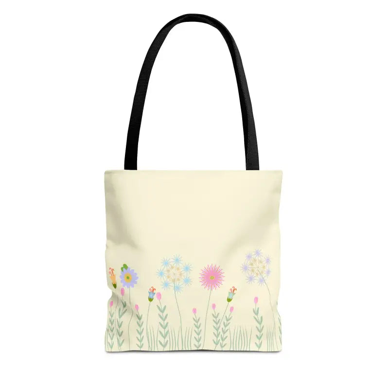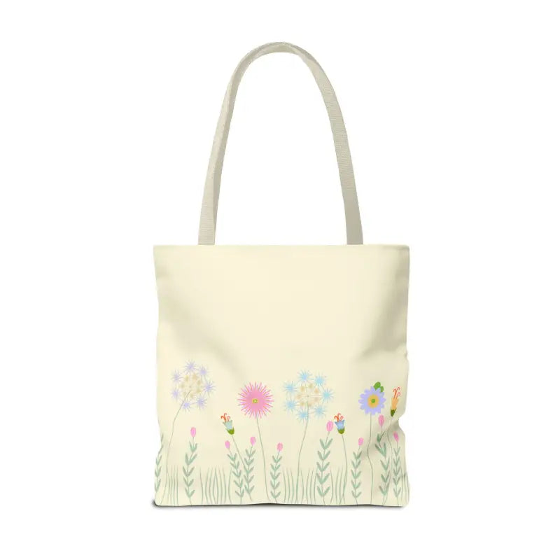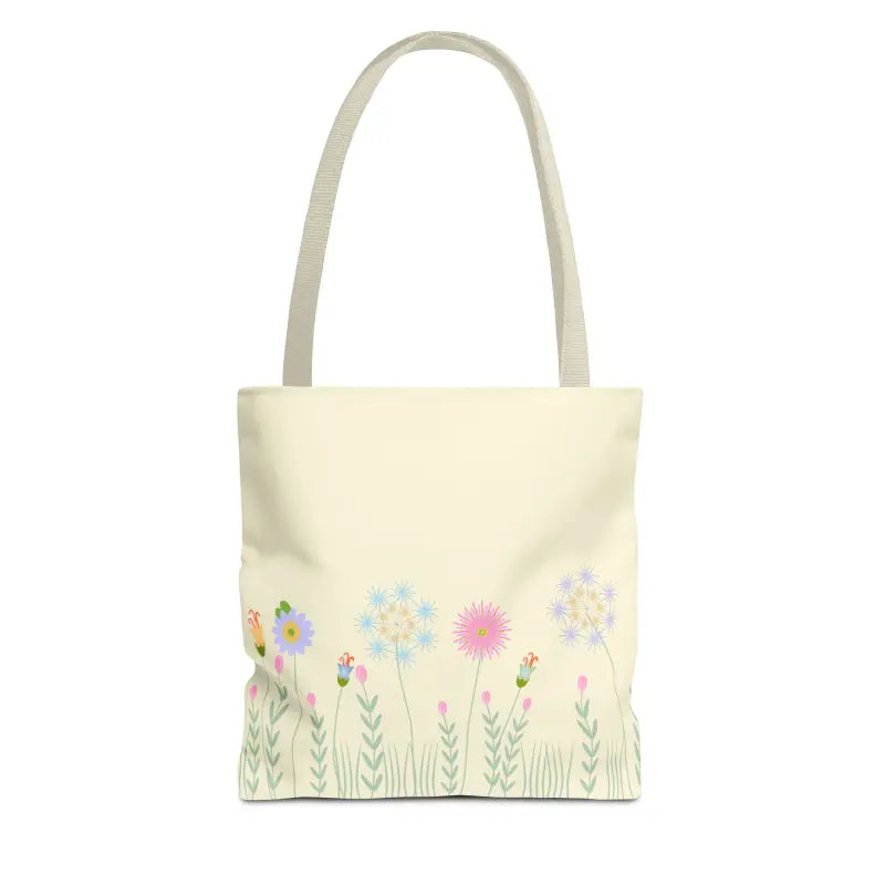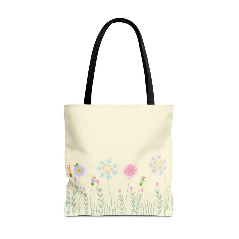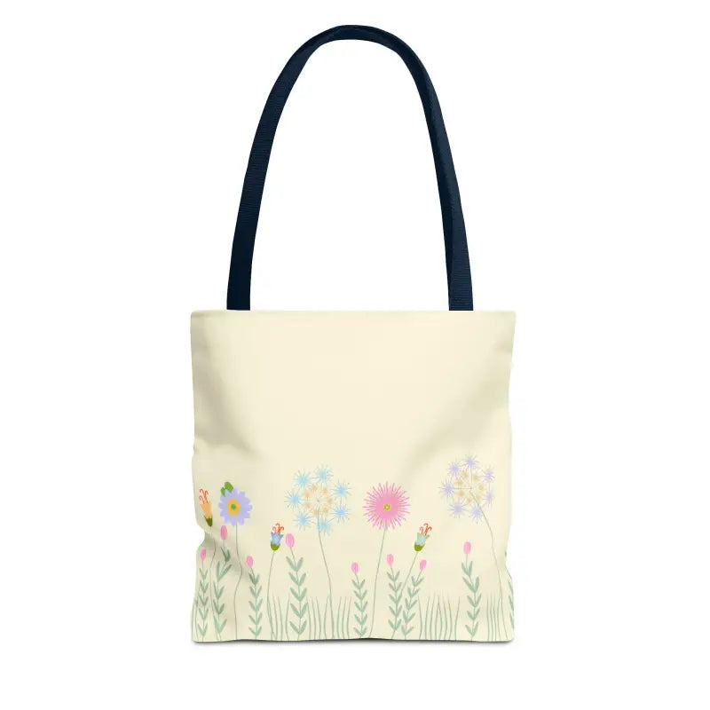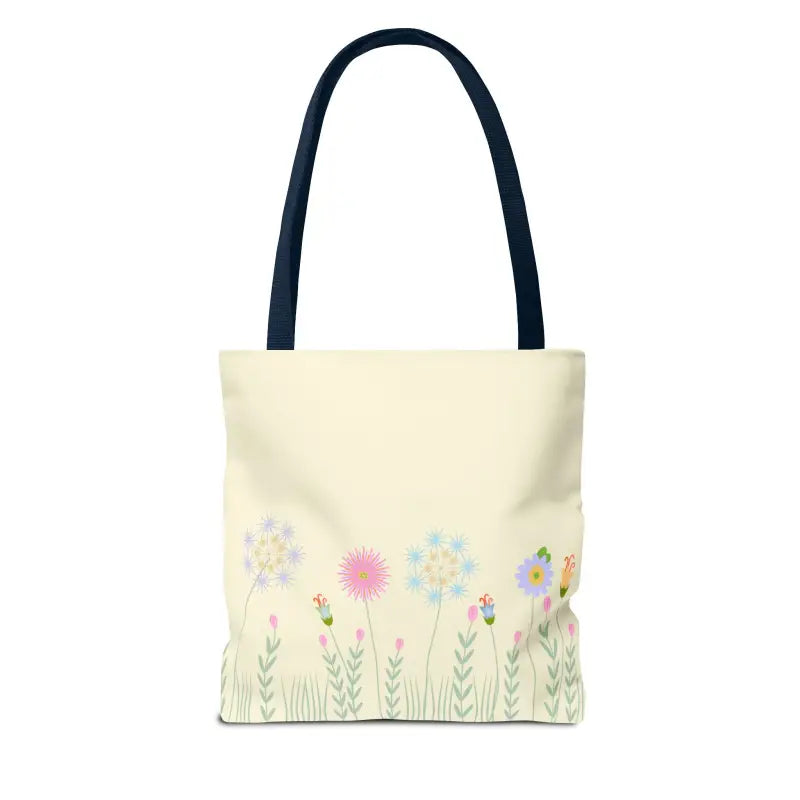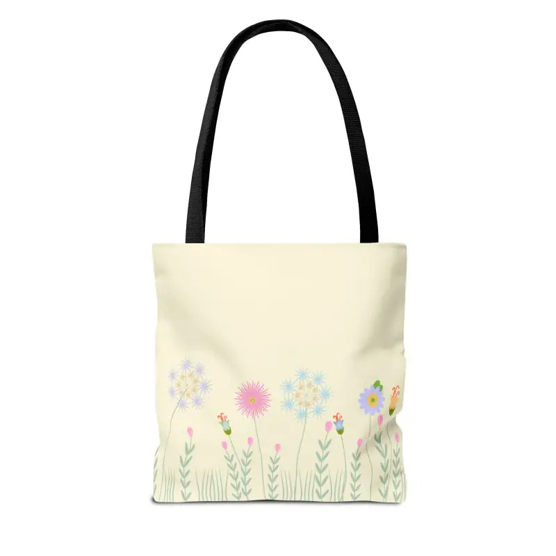 Wild flowers AOP Tote Bag. This practical, high-quality Tote Bag is available in three sizes. All over print provides comfort with style at the beach or out in town. Made from reliable materials, lasting for seasons.