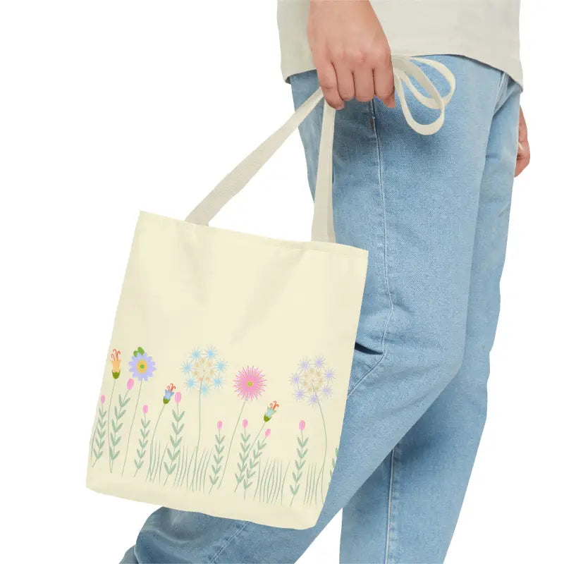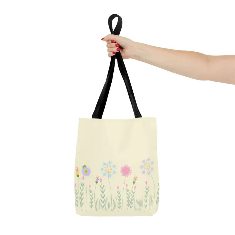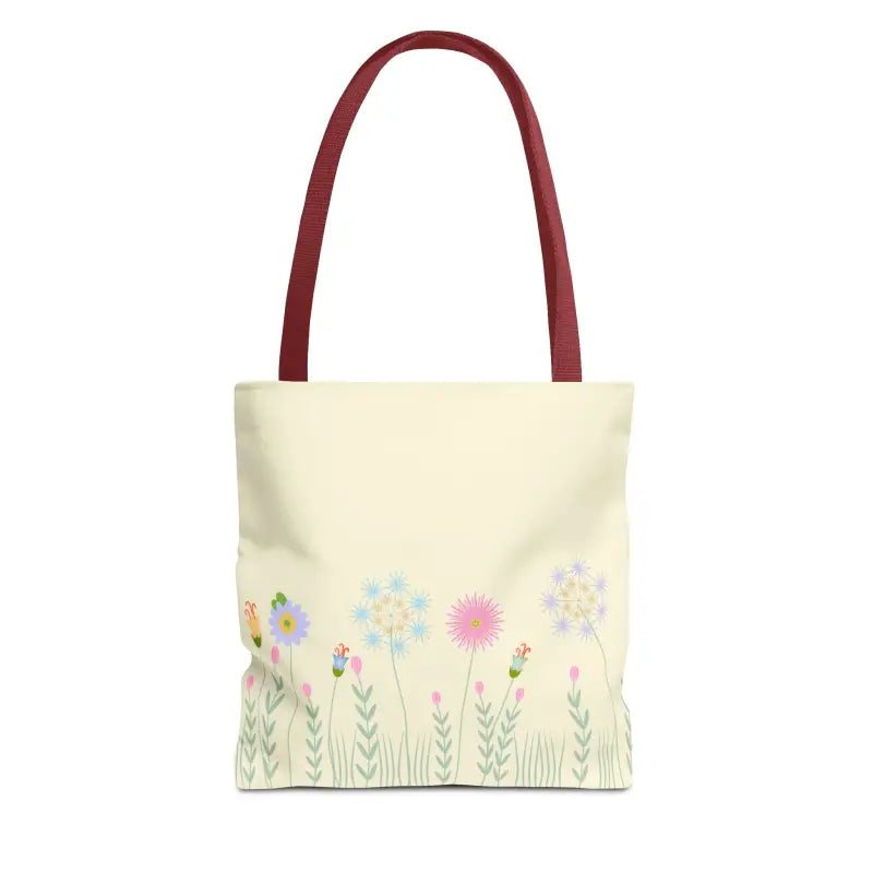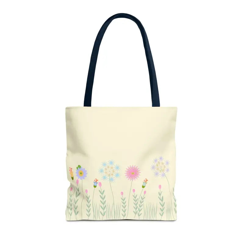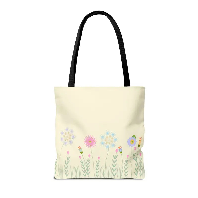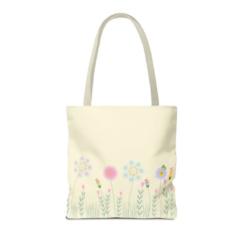 Wild flowers AOP Tote Bag. This practical, high-quality Tote Bag is available in three sizes. All over print provides comfort with style at the beach or out in town. Made from reliable materials, lasting for seasons.