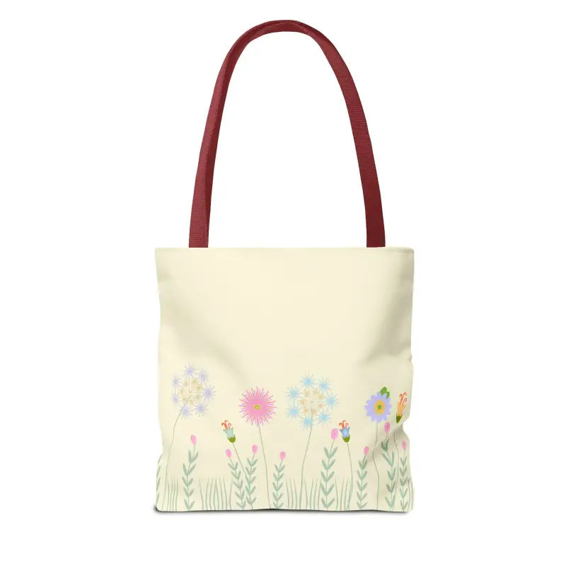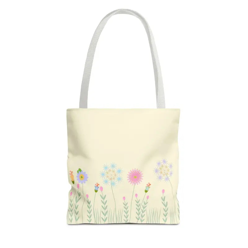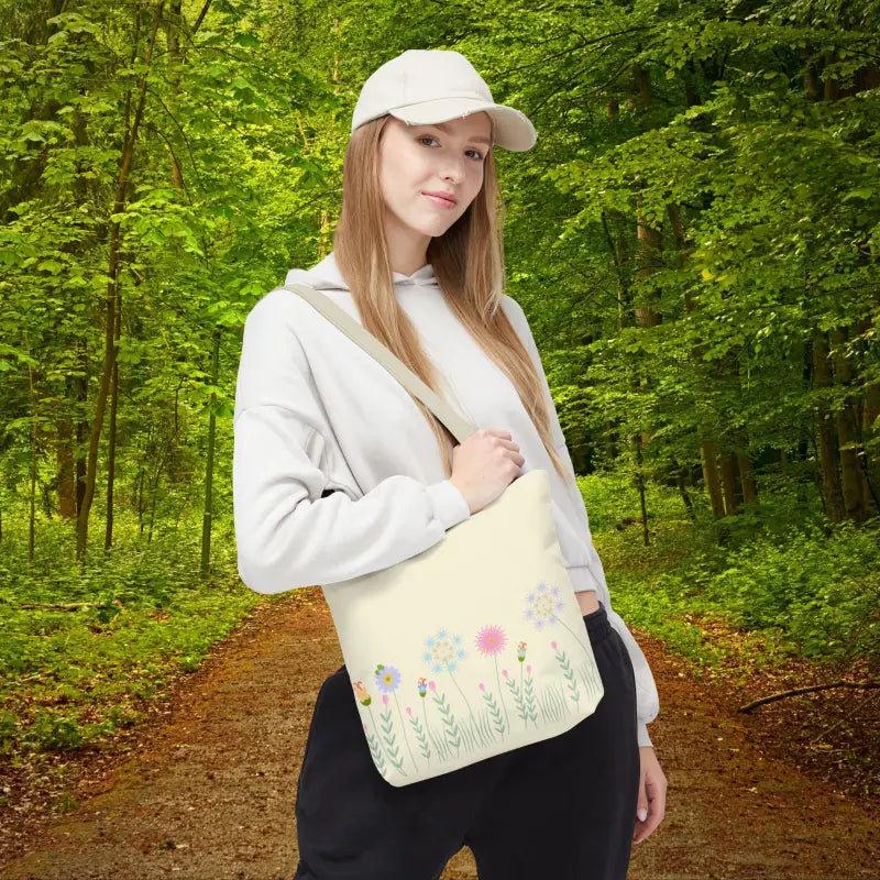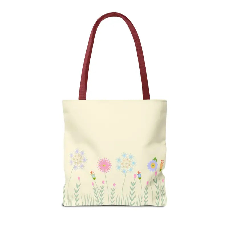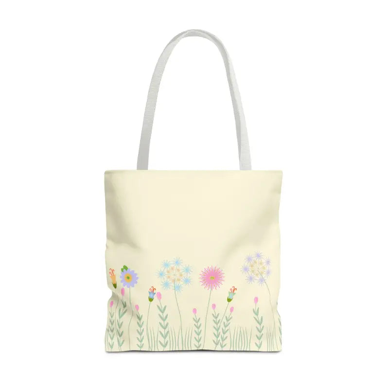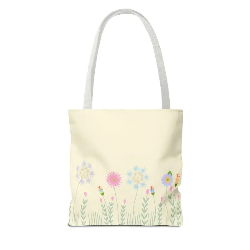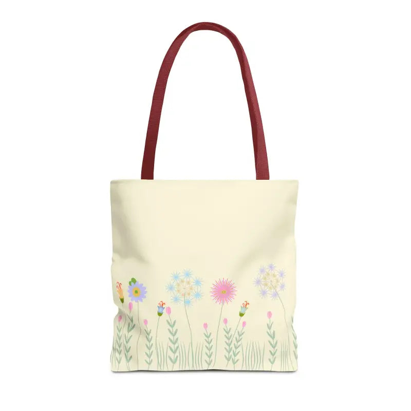 Wild flowers AOP Tote Bag. This practical, high-quality Tote Bag is available in three sizes. All over print provides comfort with style at the beach or out in town. Made from reliable materials, lasting for seasons.