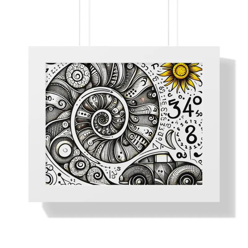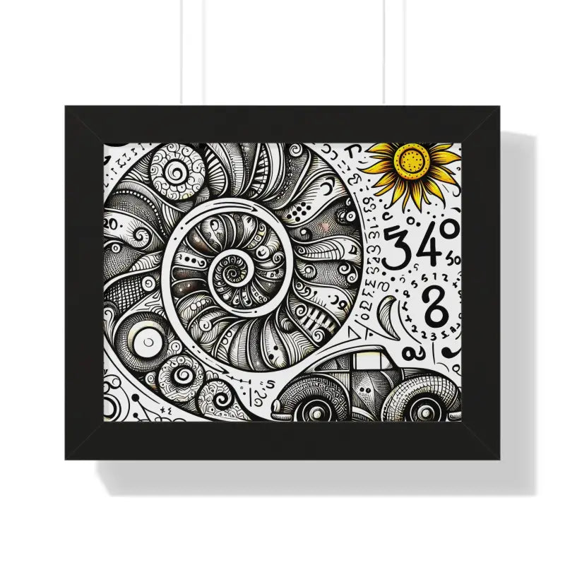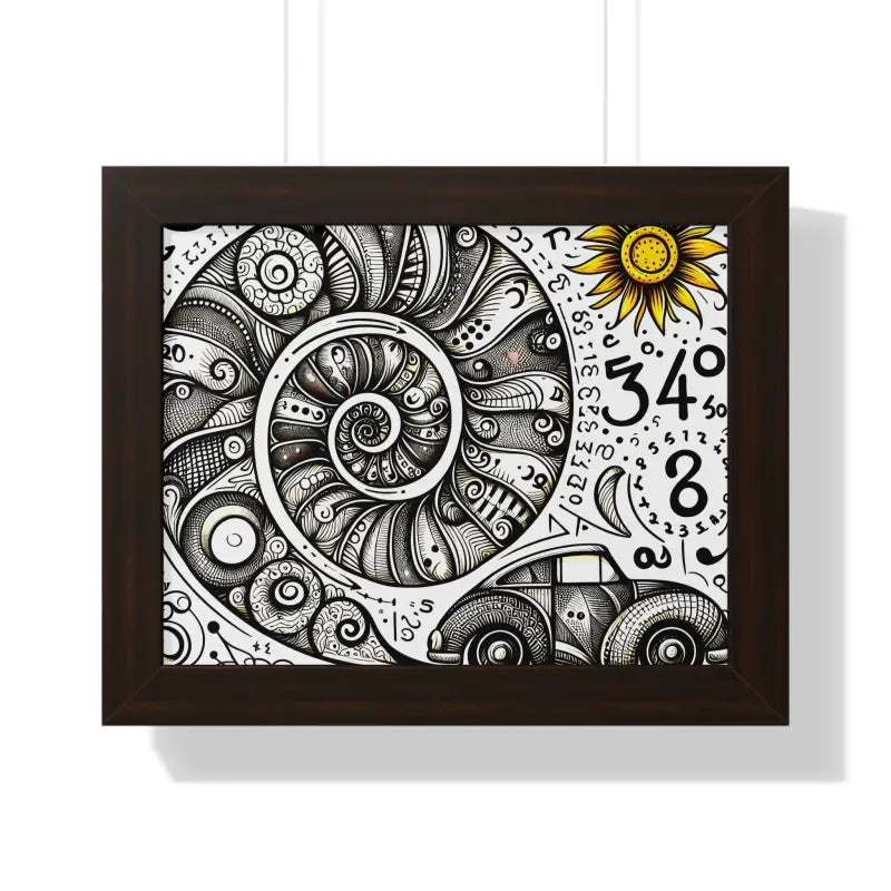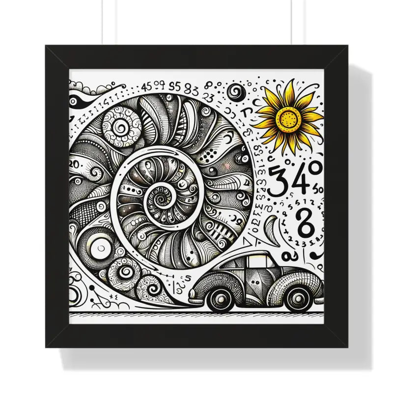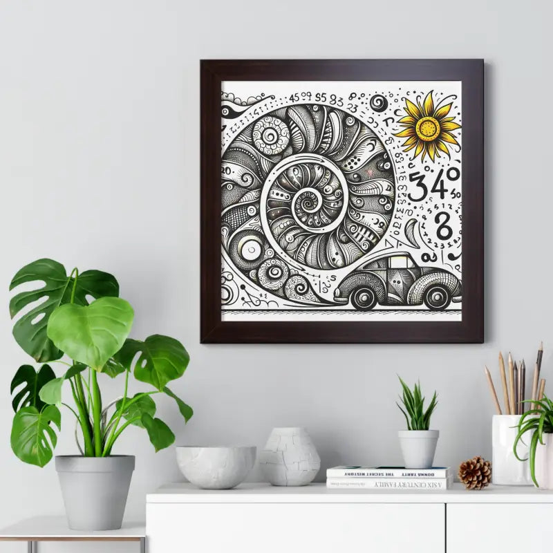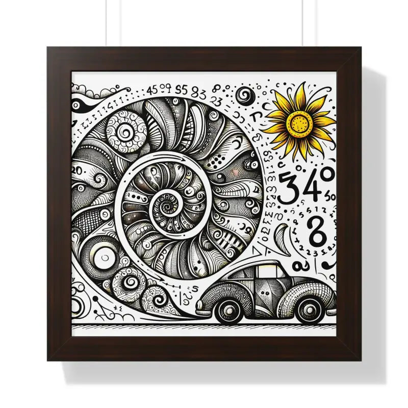 Print: Artistic Fibonacci Framed design bursting with playful geometry and bold pigment inks that celebrate intricate, dynamic visuals in a compact, elegant composition.