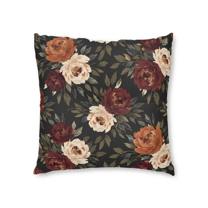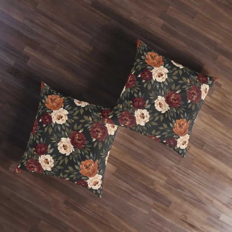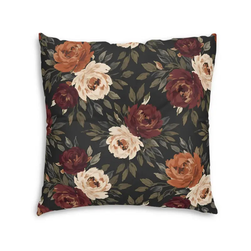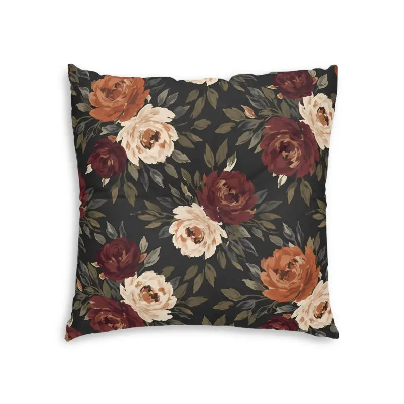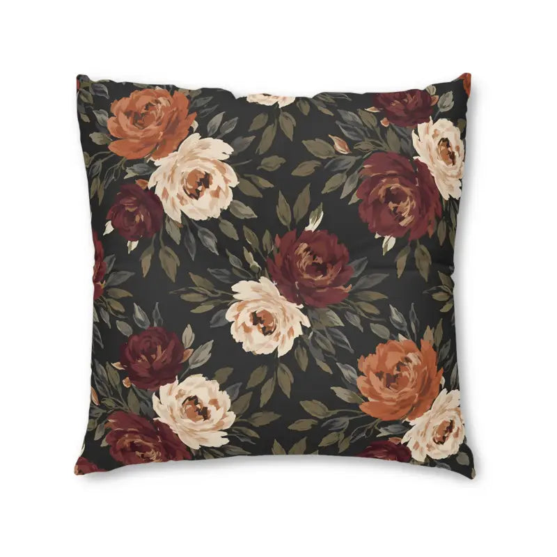 Deep wine reds mingle with warm rusts and creamy ivory blooms against a dramatic charcoal backdrop. The generous square design features elegant tufting that adds dimensional texture while the moody floral pattern brings sophisticated cottagecore vibes to your space.