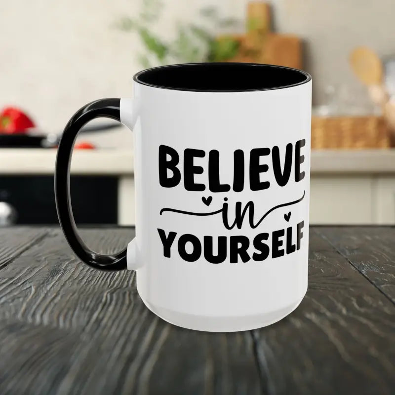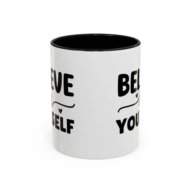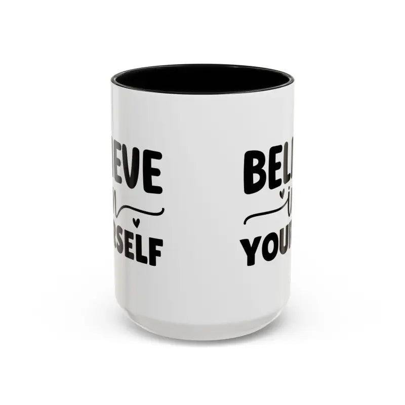 Believe in yourself, Accent Coffee Mug (11, 15oz). Meet your next favorite morning companion, the accented ceramic mug. This mug brings the perfect blend of style and functionality to elevate your coffee or tea ritual. Available in two generous sizes, 11oz (0.33 l) and 15oz (0.44 l), this mug offers ample space for your favorite brew. Made with white ceramic and sporting a sleek glossy finish with eye-catching contrast, this mug is a bliss both to use and to look at. The ergonomic C-shaped handle provides a comfortable grip, while the lead and BPA-free construction guarantee peace of mind with every sip.