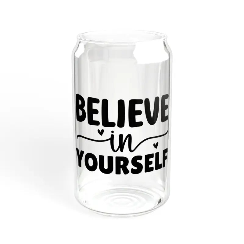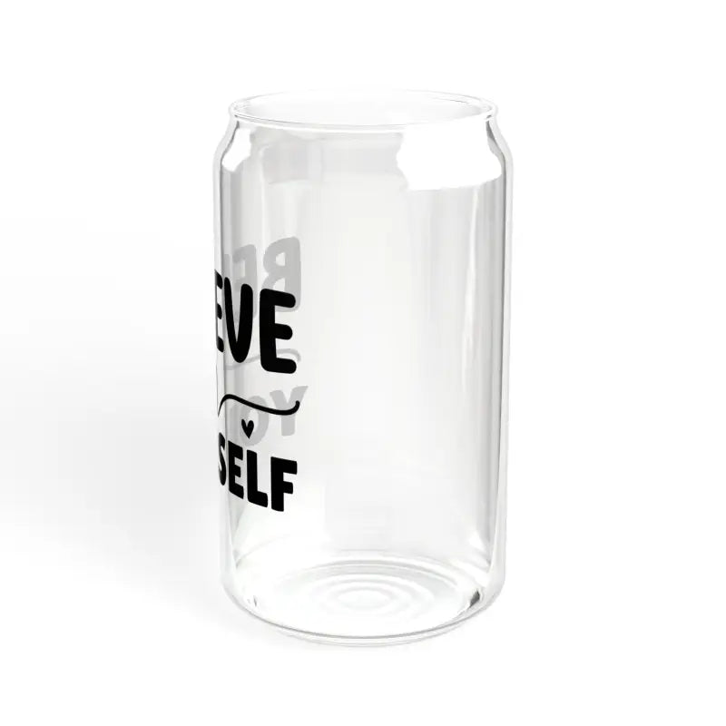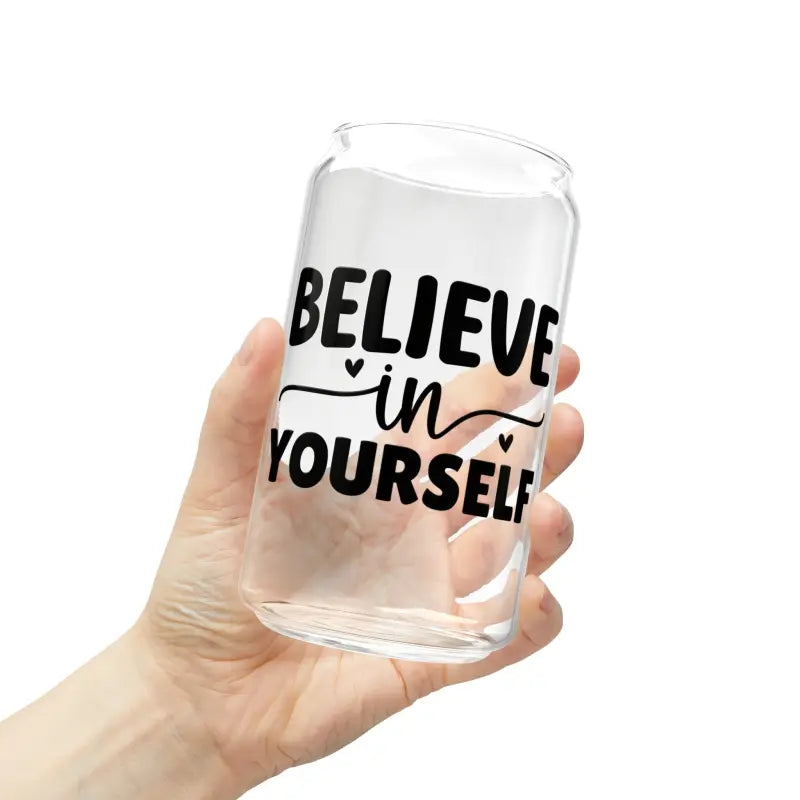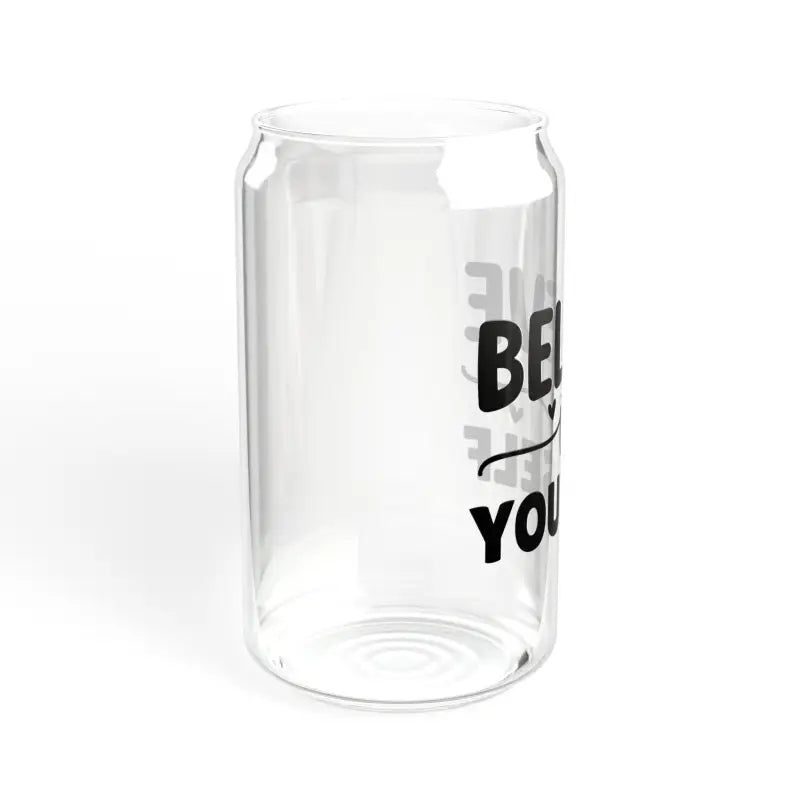 Believe in yourself, BPA free, Sipper Glass, 16oz. Quench your thirst in style with our 16oz Sipper Glass. Made from clear tempered glass, it's durable, sleek, and perfect for refreshing cocktails, juices, or any beverage you fancy. Choose between the classic version or opt for the version equipped with a Gasket-push Bamboo lid and Tritan straw for added convenience. This sipper glass is FDA Certified, BPA Free, and Cal. Prop 65 compliant, ensuring your safety and peace of mind with every sip.