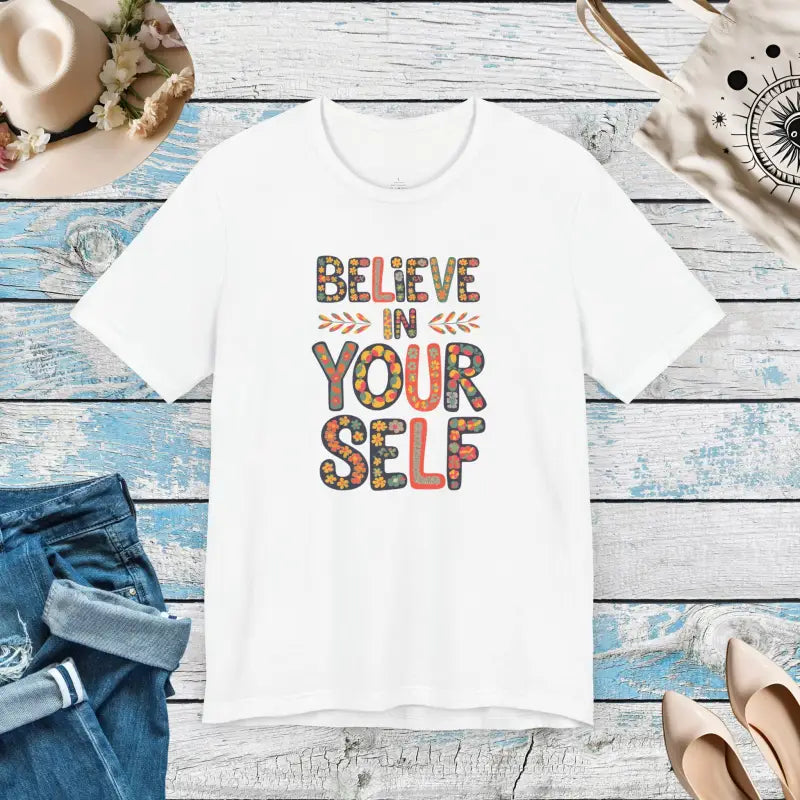 Embrace the power of self-belief with our amazing 'Believe in Yourself' Floral Unisex Jersey Short Sleeve Tee! This timeless piece of apparel effortlessly combines style and comfort, making it a staple for any wardrobe. The gentle touch of Airlume combed and ringspun cotton ensures that each wear feels like a warm hug, while the premium floral print turns this tee into a beloved favorite you’ll want to wear every day.