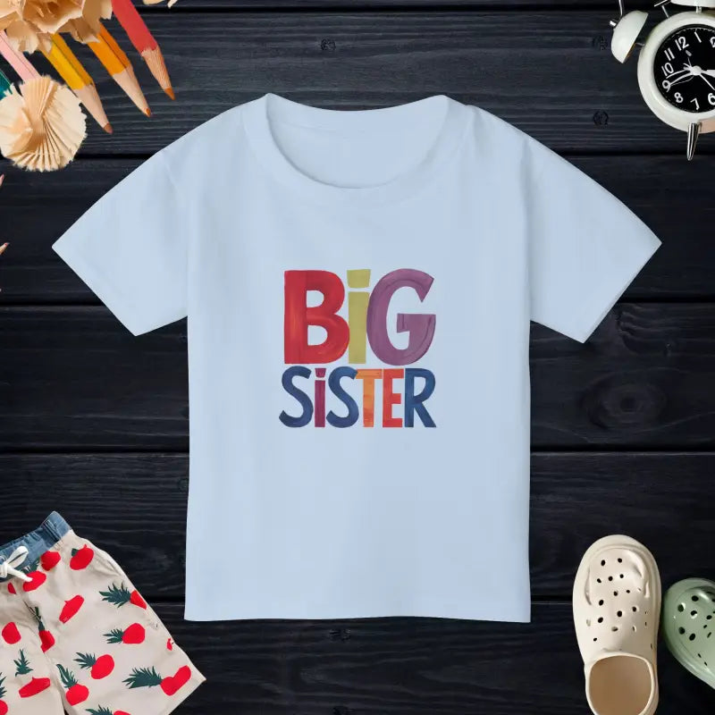 Big sister Heavy Cotton Toddler T-shirt. The Gildan 5100P Heavy Cotton™ tee for toddlers brings incredible style and ecologic sensibility to the table. Made with 100% cotton (Sport Grey is 90/10 cotton/polyester), each tee offers top-tier softness to the touch. Meanwhile, the classic width and rib collar add a nice touch of style and all-day comfort. Gildan is a proud member of the US Cotton Trust Protocol and each tee is printed with OEKO-TEX certified, low-impact dyes.