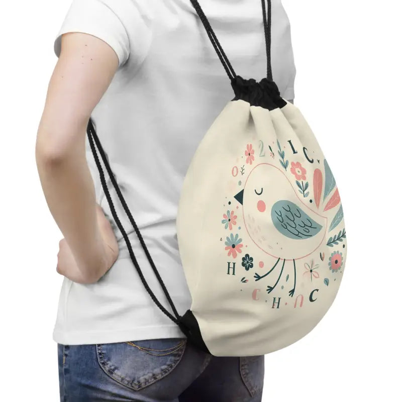 Bird with pastel flowers Drawstring Bag. Lightweight, durable and amazing-looking - all the best qualities in one package! Thinking of a quick trip to the gym, store or beach? Take this drawstring gym bag with you, it’s the perfect storage system for those quick hops and light travels when you don’t feel like carrying a lot of excess items.