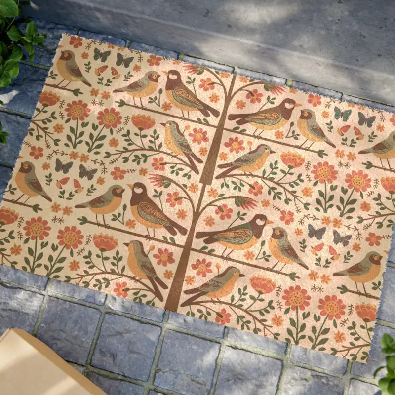- Charming birds on trees doormat print instantly adds curb appeal and warmth