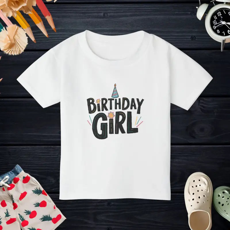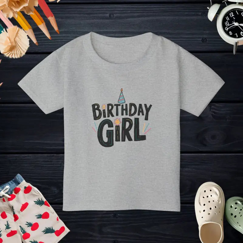 Birthday girl Heavy Cotton Toddler T-shirt. The Gildan 5100P Heavy Cotton™ tee for toddlers brings incredible style and ecologic sensibility to the table. Made with 100% cotton (Sport Grey is 90/10 cotton/polyester), each tee offers top-tier softness to the touch. Meanwhile, the classic width and rib collar add a nice touch of style and all-day comfort. Gildan is a proud member of the US Cotton Trust Protocol and each tee is printed with OEKO-TEX certified, low-impact dyes.