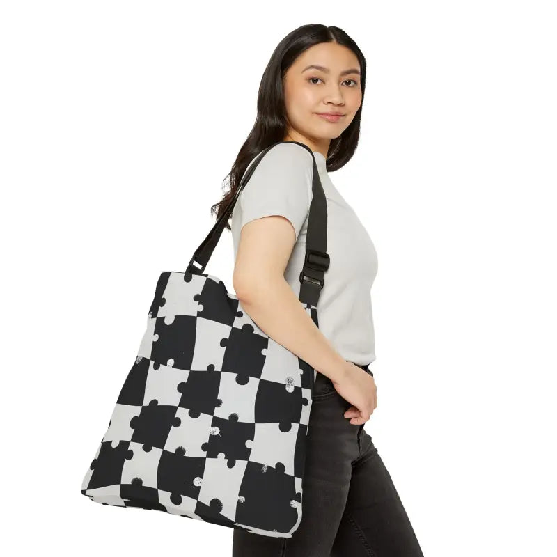 Get ready to turn heads with this puzzle piece adjustable tote that brings urban edge to your everyday adventures! Bold black and white pieces collide across the surface like fresh street art, creating a graphic statement that's equal parts playful and sophisticated.