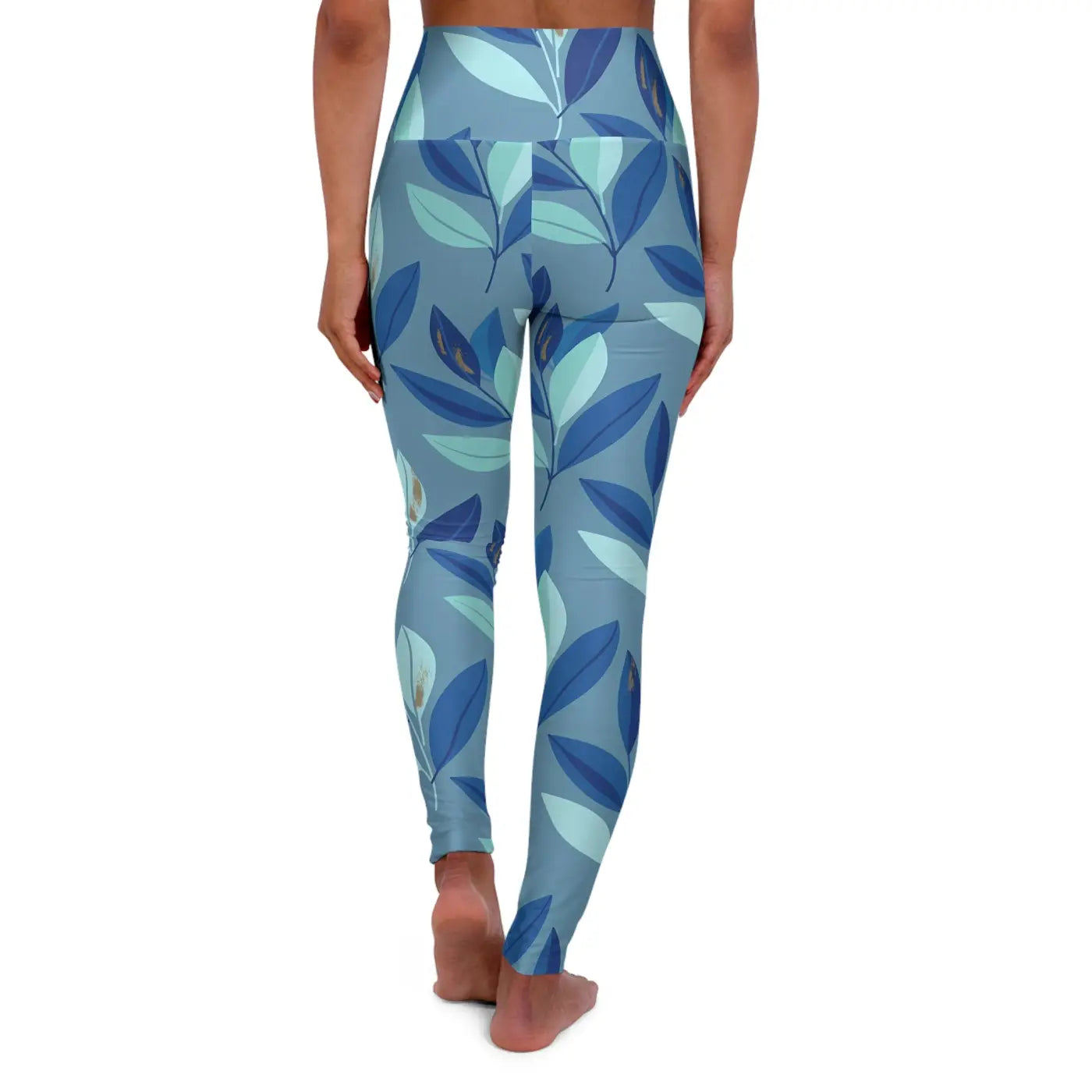 Blue Botanical High-Waist Yoga Leggings — Floral Leaf All-Over Print
