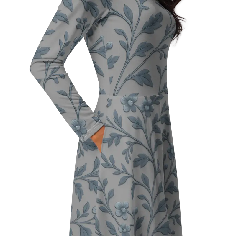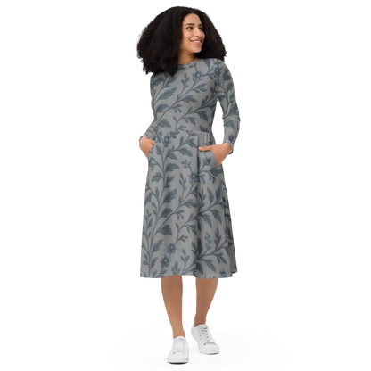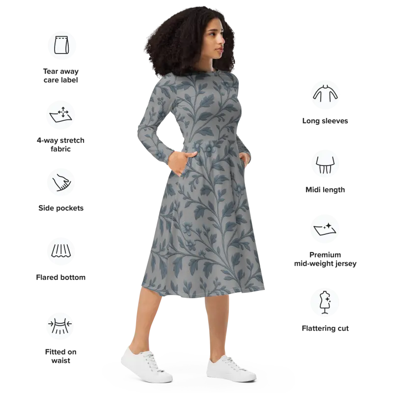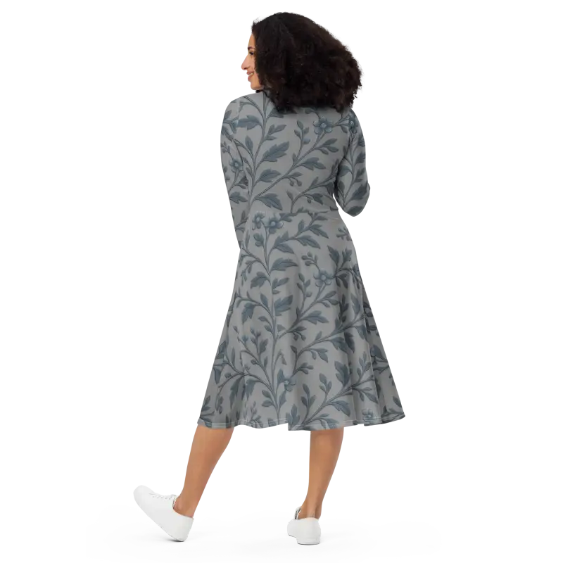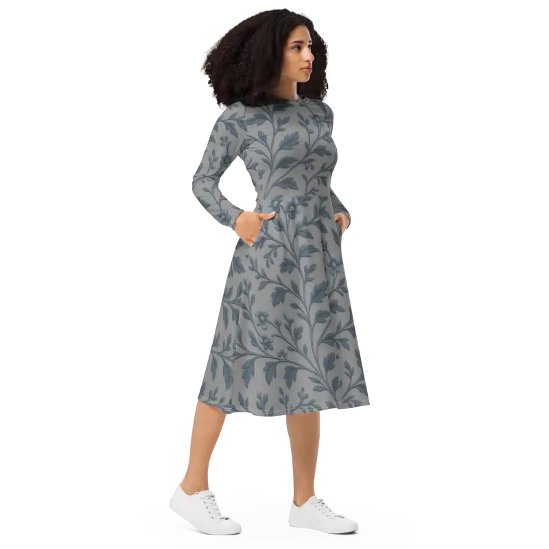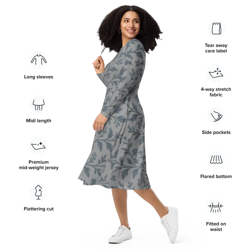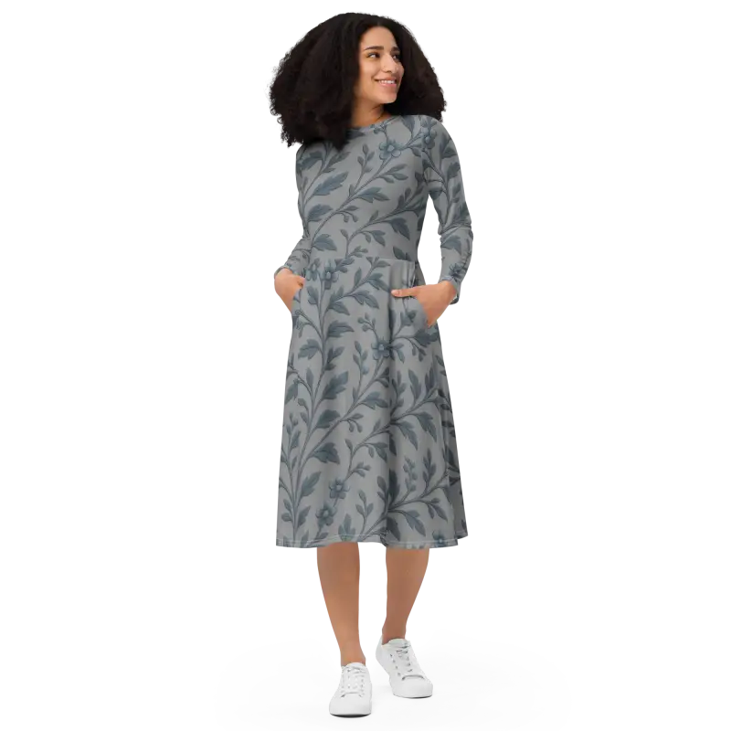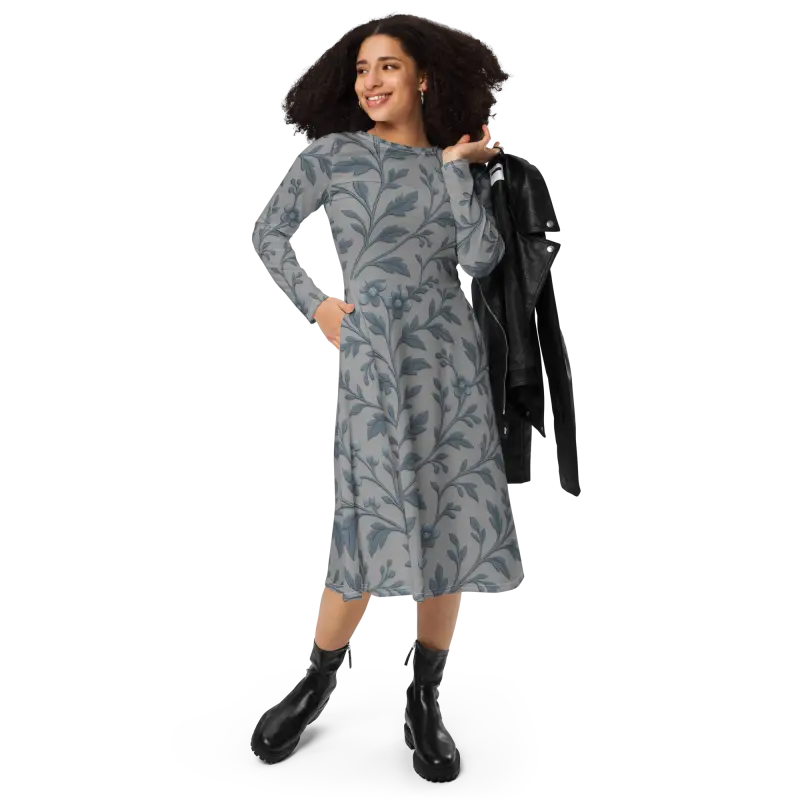 - Achieve a stunning look with the timeless charm of blue floral vines and the trendy appeal of a long sleeve midi, making this dress your ultimate go-to outfit.