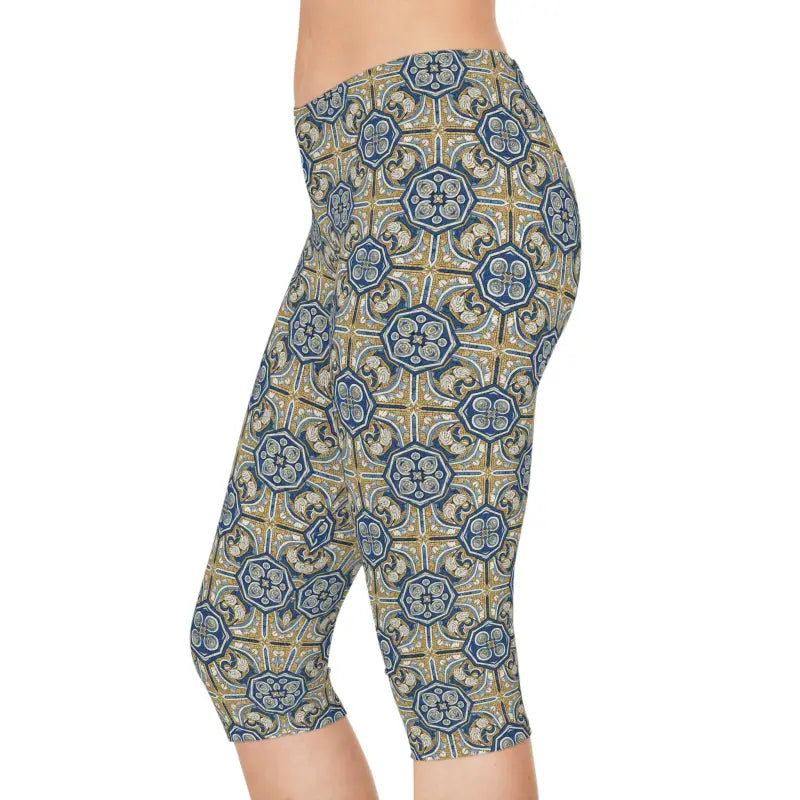 Blue Gold Moroccan Tile Capri Leggings - DipaliZ