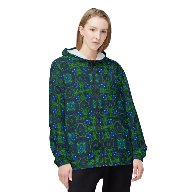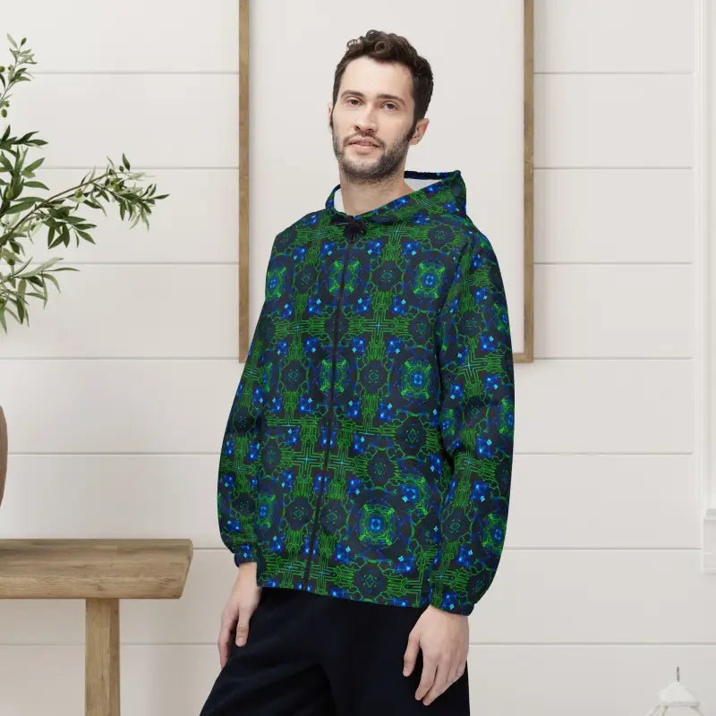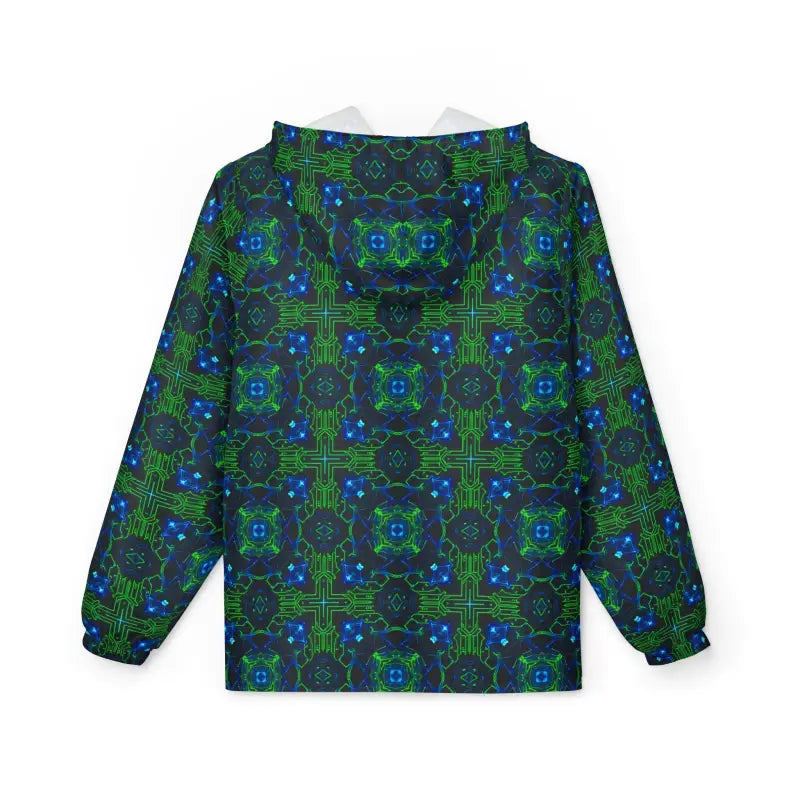 Picture yourself stepping out into a crisp morning where the wind carries just enough bite to make you grateful for that perfect layer. This blue green kaleidoscope windbreaker wraps you in a stunning visual experience that turns heads without shouting for attention. One side panel explodes with mesmerizing kaleidoscope patterns in deep blues and oceanic greens that shift and dance like light through stained glass, while the rest stays brilliantly white for that clean, contemporary edge. The design feels like carrying a piece of modern art gallery on your shoulders, transforming the ordinary walk to your favorite cafe or weekend market stroll into something visually electric. It's protection that refuses to be boring, style that doesn't sacrifice function, and a conversation starter that keeps you comfortable when the weather turns unpredictable.