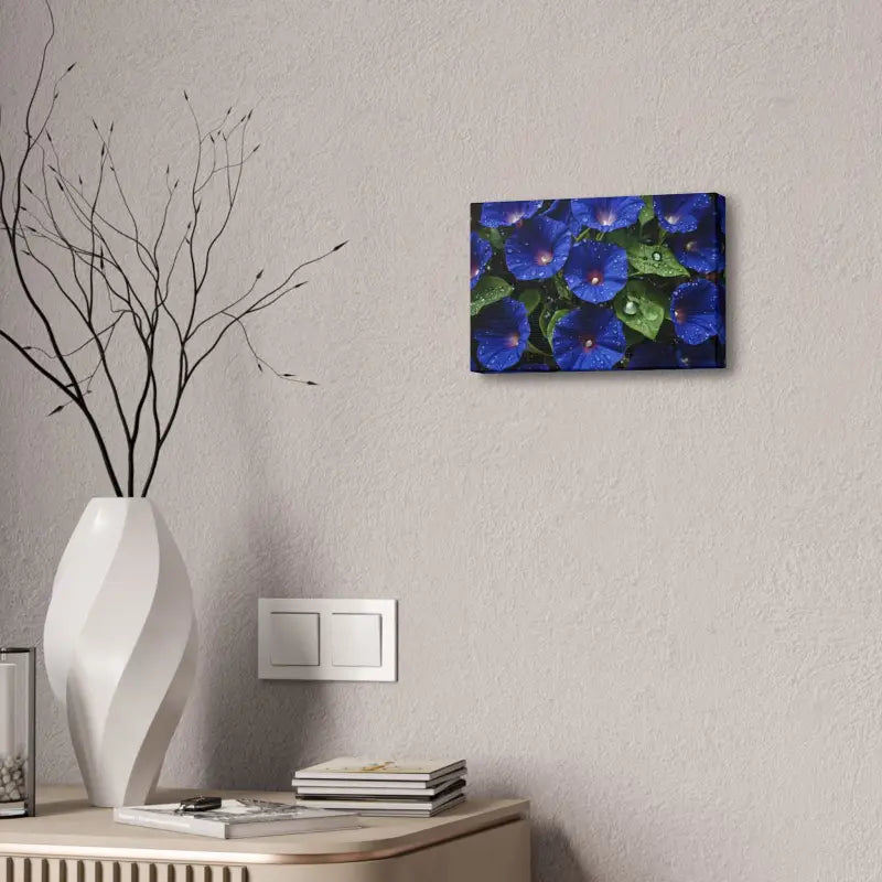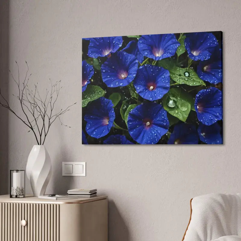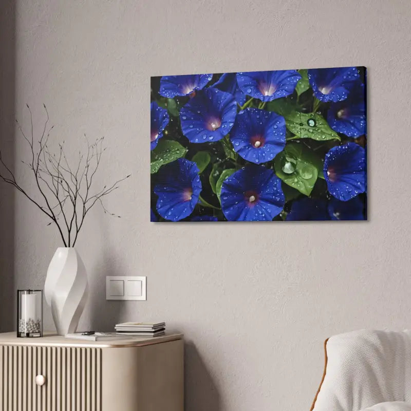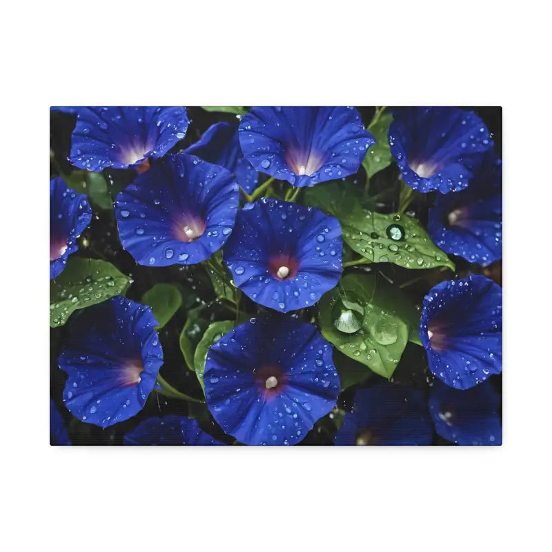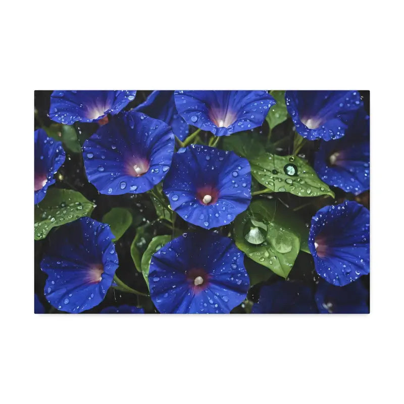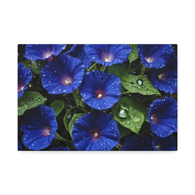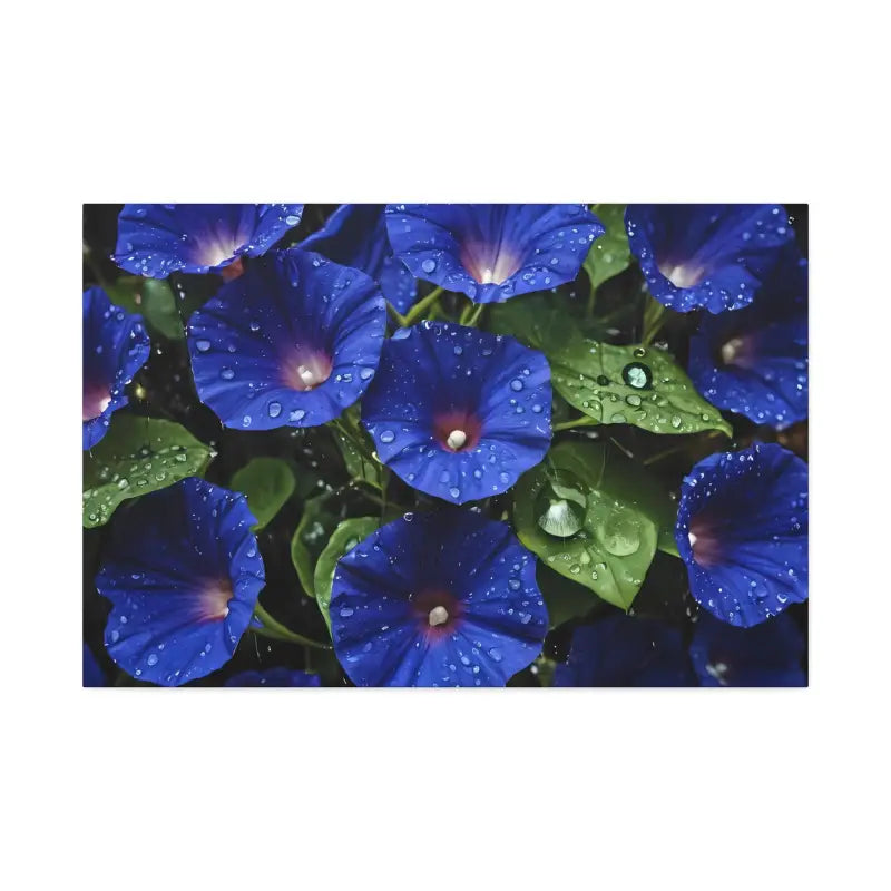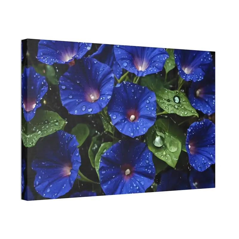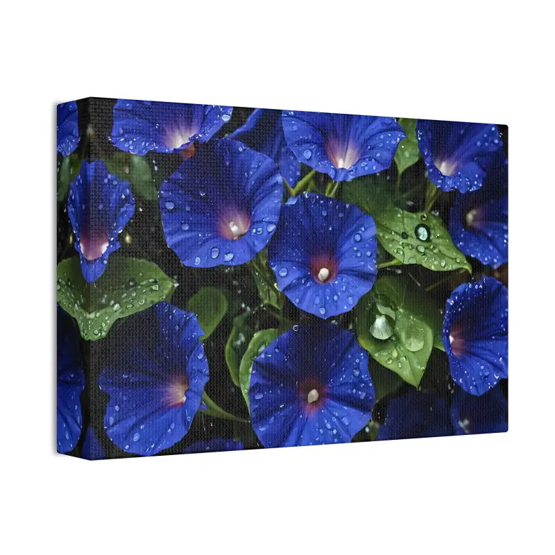 Blue Morning glory in the rain, Semi glossy finish, Canvas Stretched, 1.5''. Treat your fans and audience to a stretched canvas print of your taste that they'll love. Made with hand-stretched fabric on a wooden frame, these prints are extremely durable with a long-lasting semi-glossy finish. Your art decorates the print in vivid detail and stunning colors.