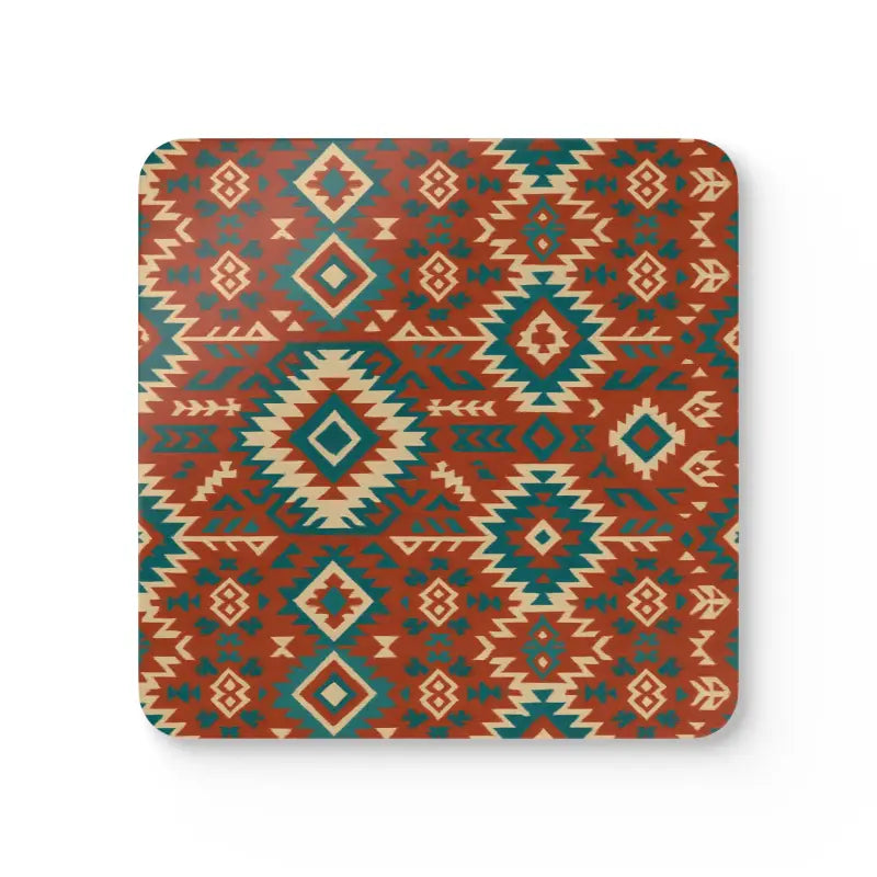 Tribal-inspired motifs in warm earth tones with pops of turquoise and coral, each coaster a mini work of art capped in high-gloss lacquer.