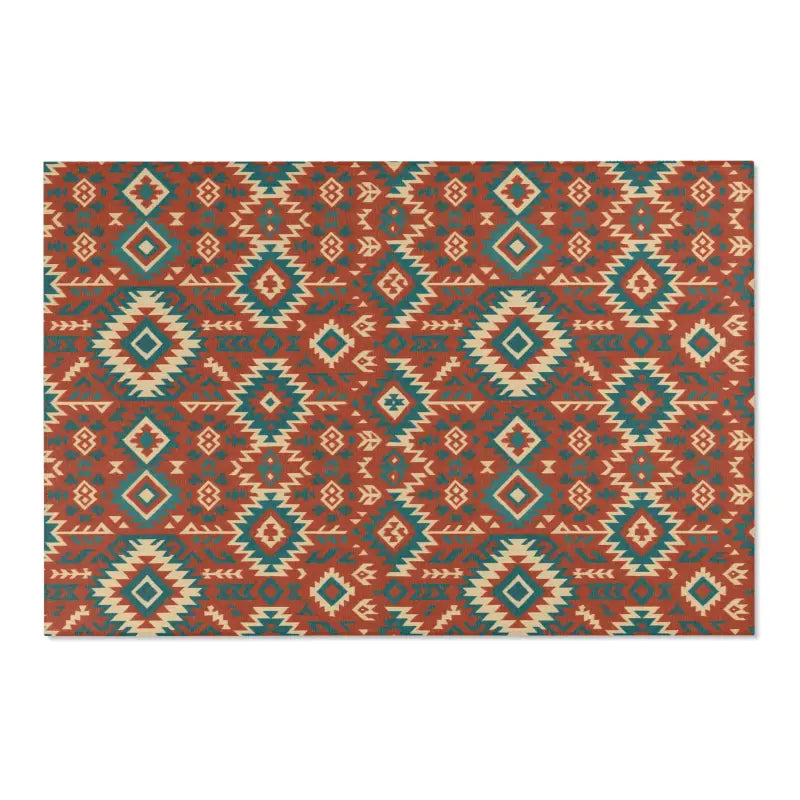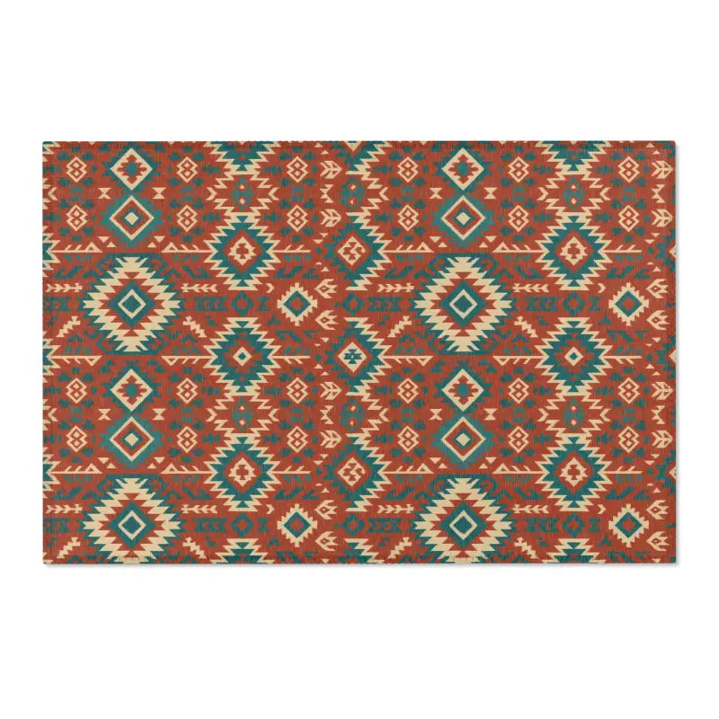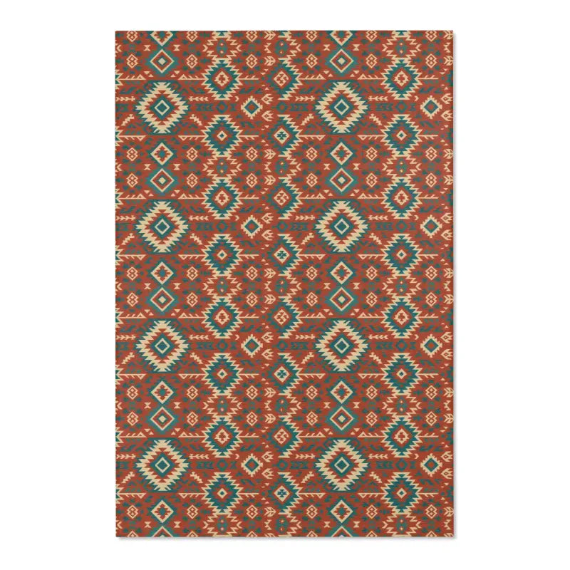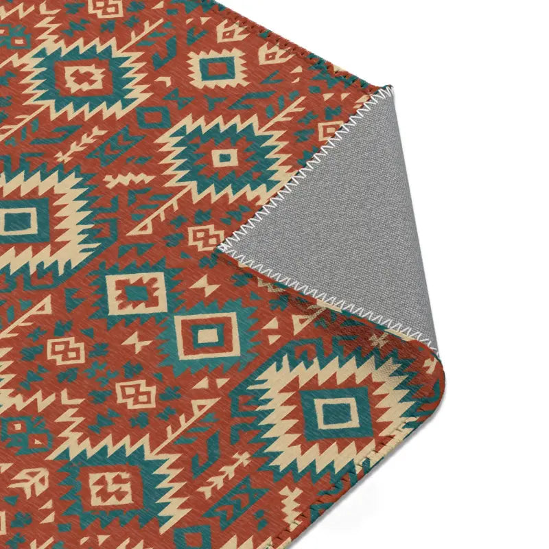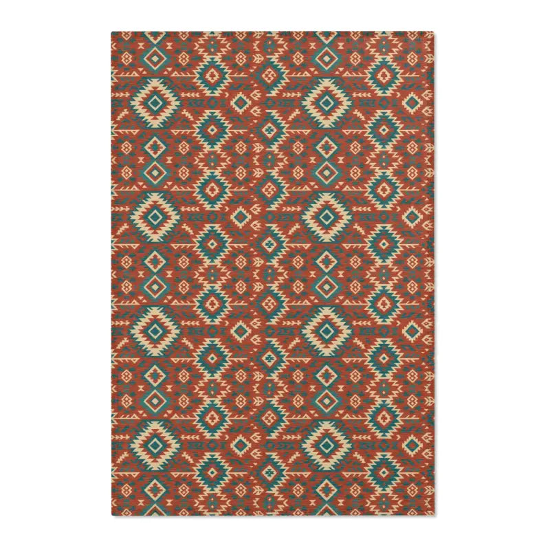 Intricate geometric tribal motifs in warm earth tones and vivid teal, offering bohemian flair in a compact 5'x7' statement piece.