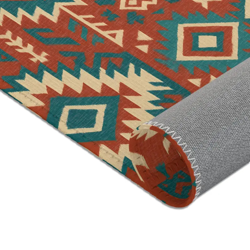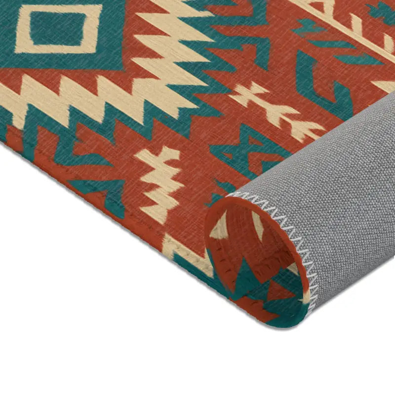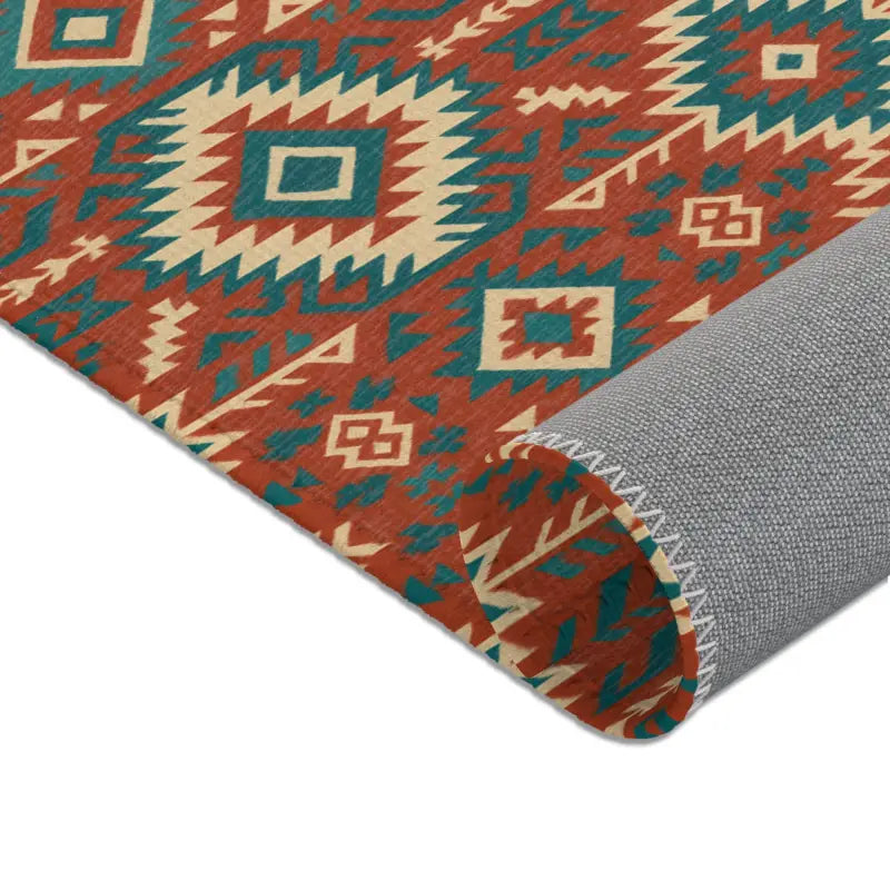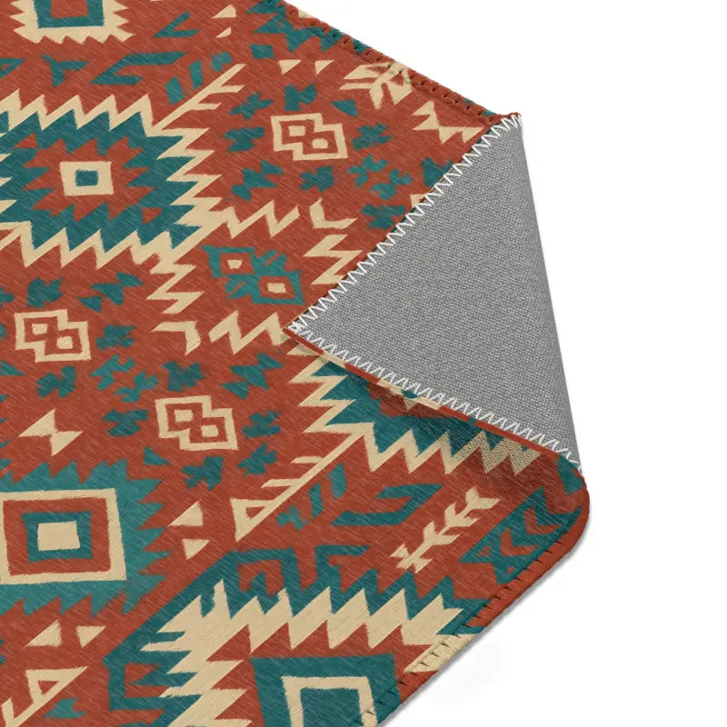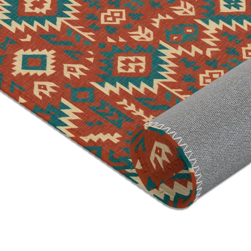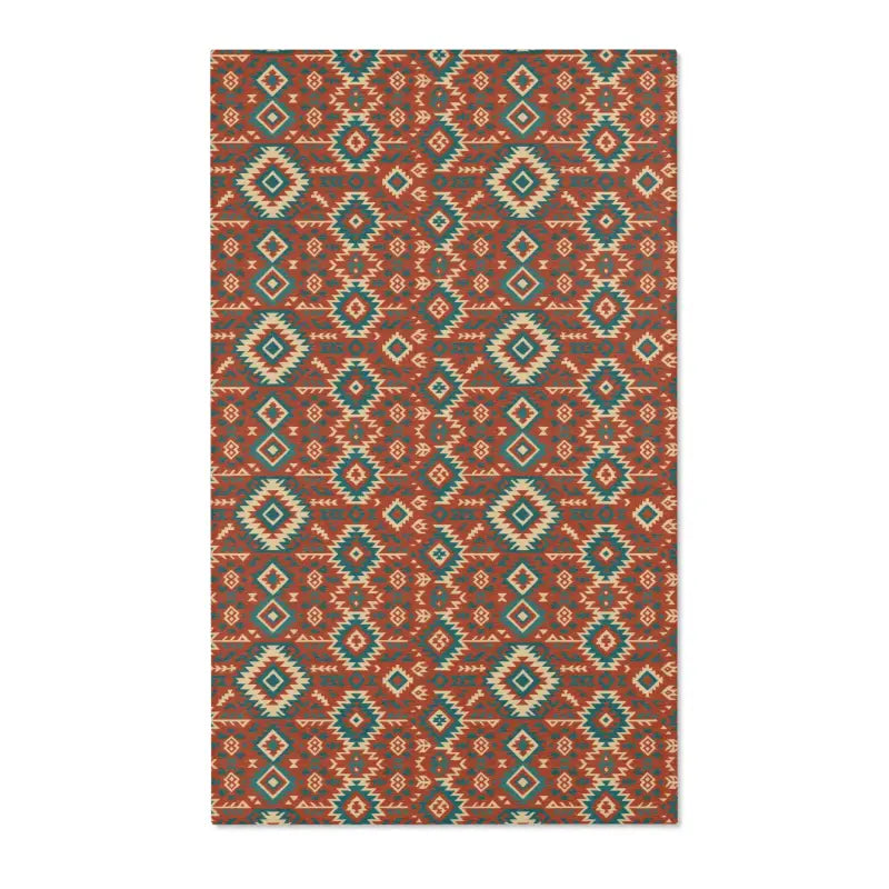 Intricate geometric tribal motifs in warm earth tones and vivid teal, offering bohemian flair in a compact 5'x7' statement piece.