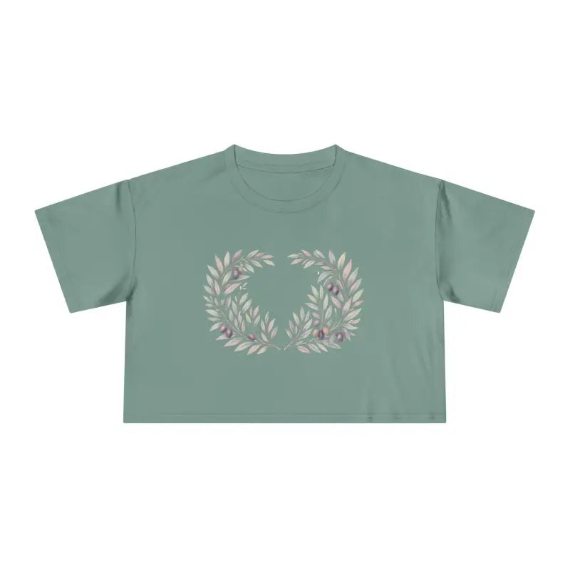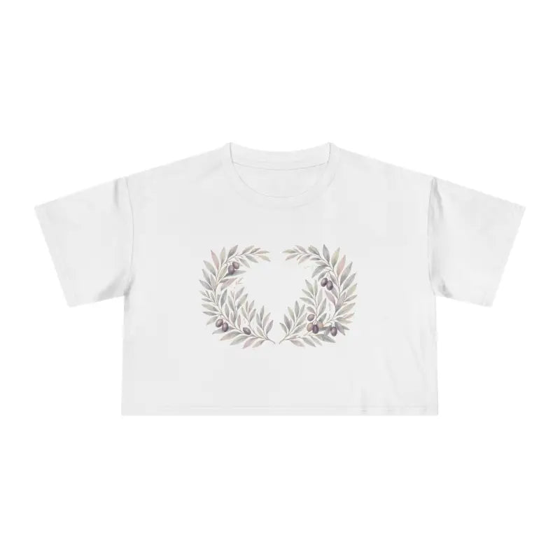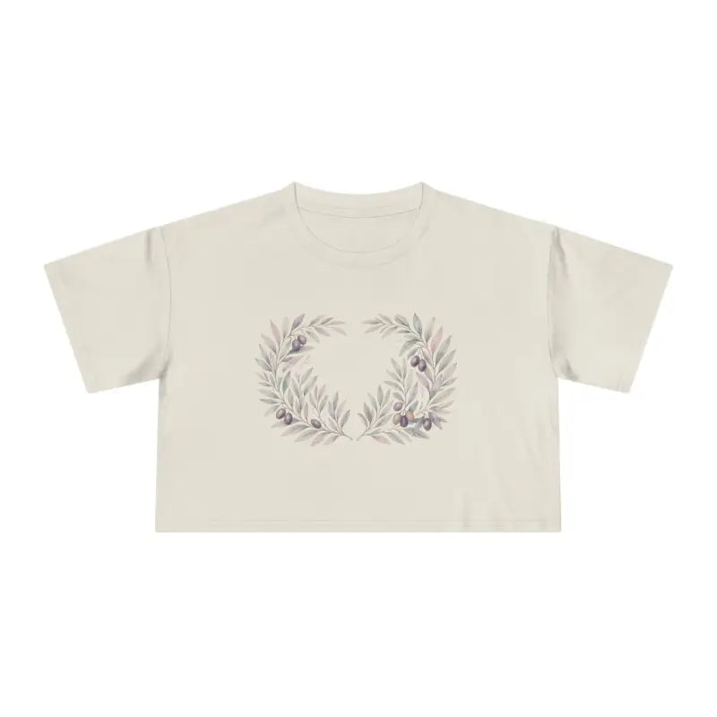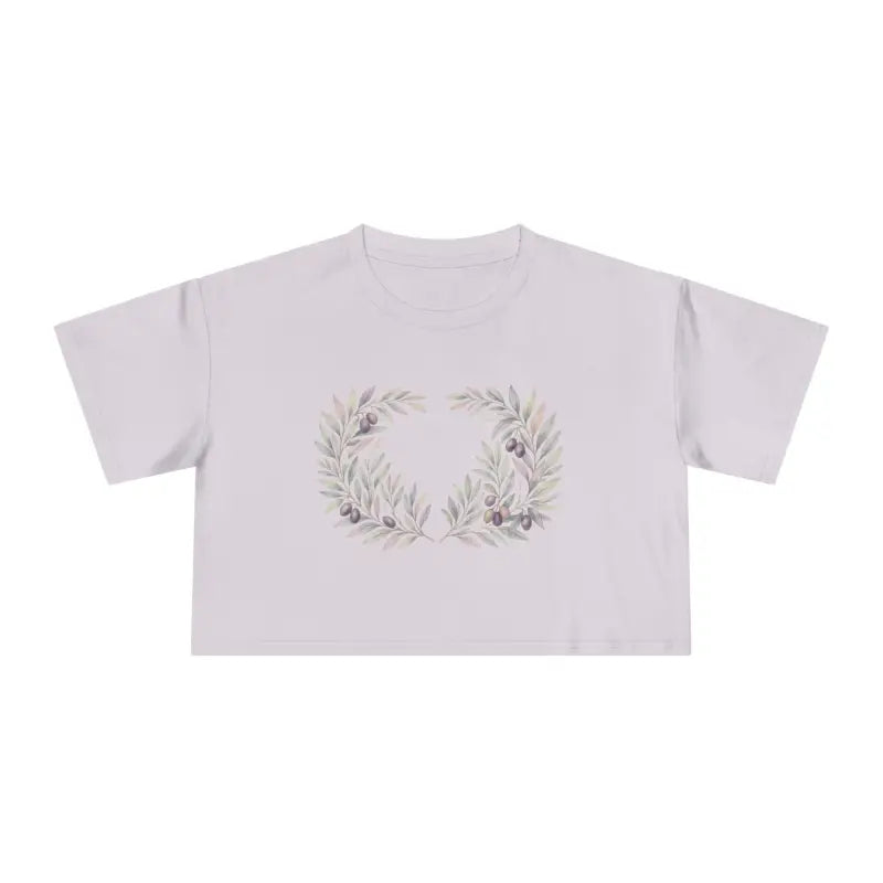 In soothing cream and dusty rose hues, this women’s crop top features delicate floral vines that dance across the fabric. The softly curved hem adds a flattering shape while keeping that casual charm intact.
