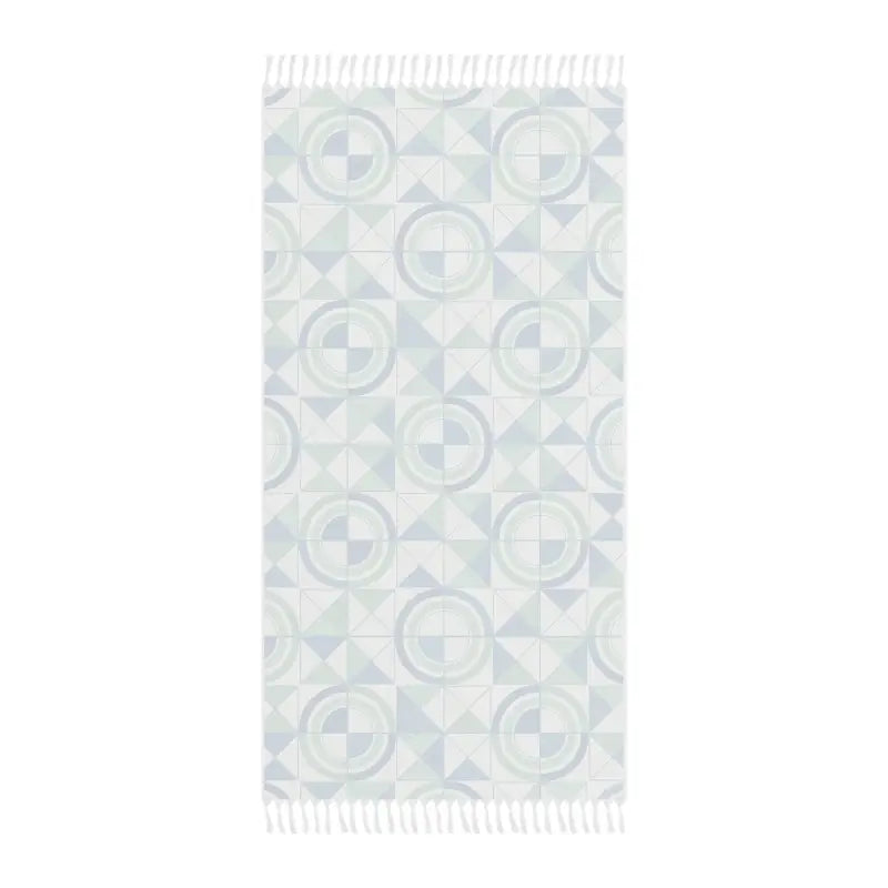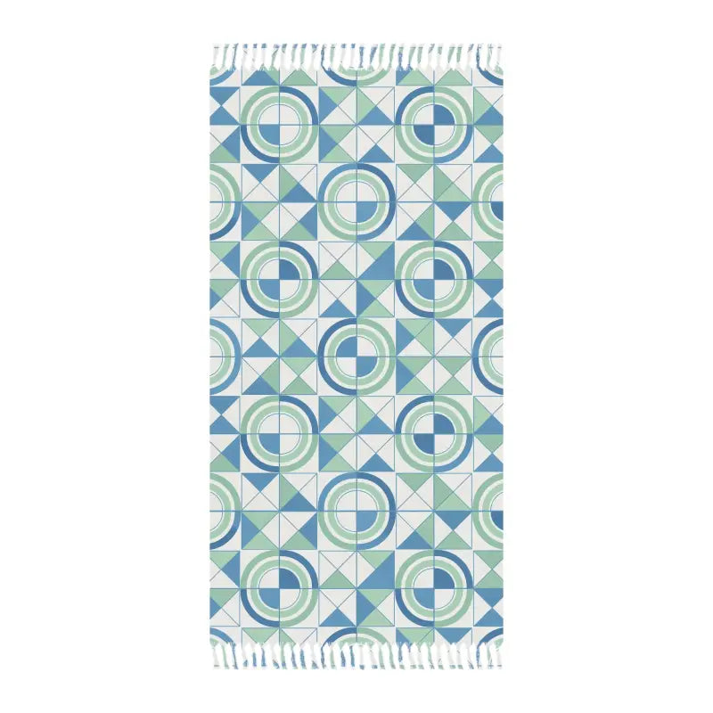Picture this: your toes sink into warm sand as you unfurl a stunning boho geometric beach towel that instantly transforms your little patch of coastline into a vibrant oasis of color and pattern. The mesmerizing blue green circular tile design catches the light like sunlit waves, drawing admiring glances from passersby who wonder where you found such a gem. This isn't just another beach essential tossed into your bag as an afterthought—it's a statement piece that announces you've got taste, wanderlust, and a knack for finding those special items that make ordinary moments feel extraordinary. The geometric beach towel becomes your canvas for adventure, whether you're claiming your spot on crowded summer shores, creating an impromptu yoga space at sunrise, or wrapping yourself in its breezy comfort after an exhilarating ocean swim. Crafted from lightweight quick-dry polyester, this beauty feels soft against sun-kissed skin while maintaining that perfect balance between substantial coverage and packable convenience. The repeating pattern of circles and triangles in seafoam greens and tranquil blues creates a hypnotic visual rhythm that channels vintage Mediterranean tile work filtered through a modern bohemian lens, telling everyone around you that you appreciate artistry in everyday objects and refuse to settle for boring basics. Toss it over your shoulders as an impromptu beach coverup during those breezy late afternoons, spread it across picnic tables for elevated outdoor dining, drape it as a decorative throw over your couch to keep vacation vibes alive year-round, use it as a lightweight blanket for outdoor concerts and festivals, or pack it as your go-to travel companion for hostel stays and spontaneous road trips to hidden swimming holes.