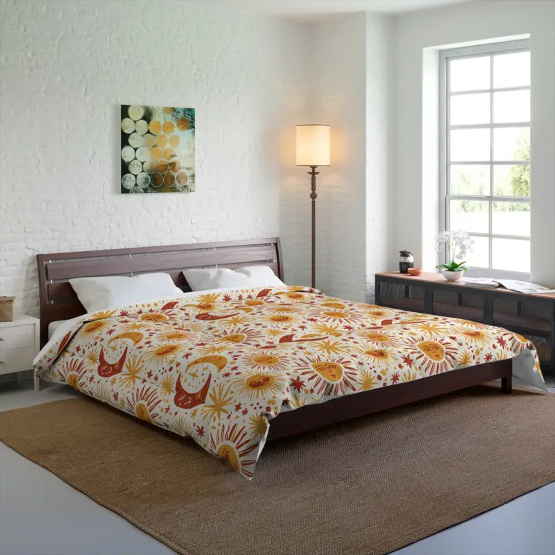 Picture golden suns dancing with mystical moons across soft microfiber polyester in gorgeous rust, cream, and amber tones. This retro celestial floral design brings faded vintage vibes that feel both nostalgic and fresh, creating the perfect backdrop for lazy Sunday mornings and cozy reading sessions.