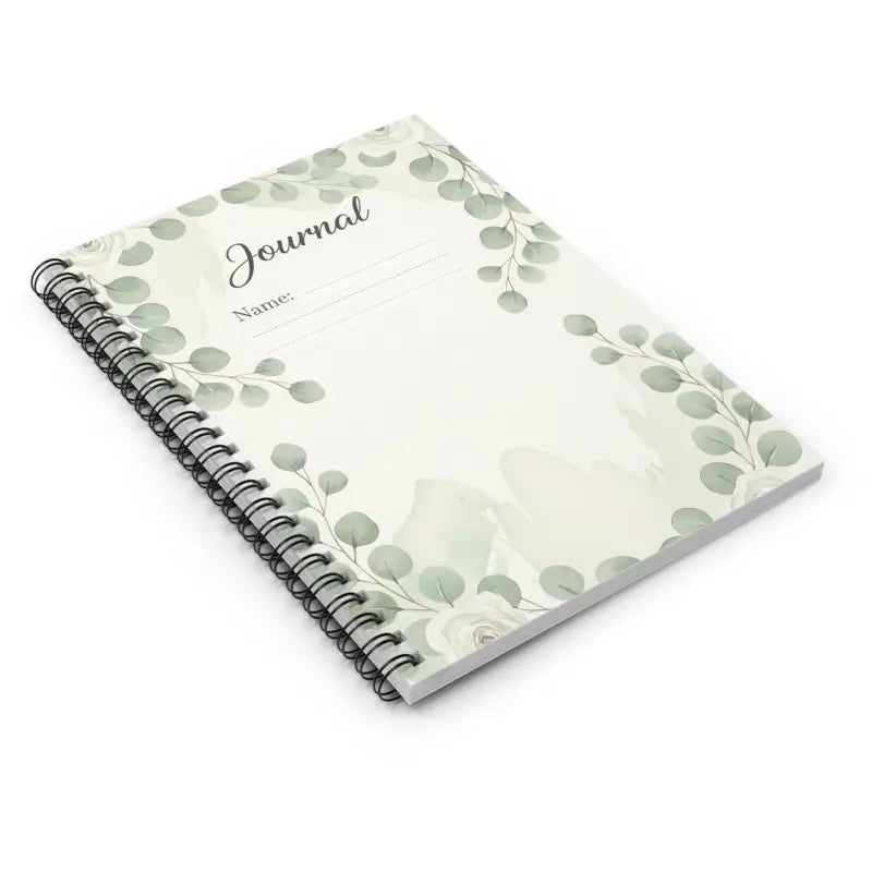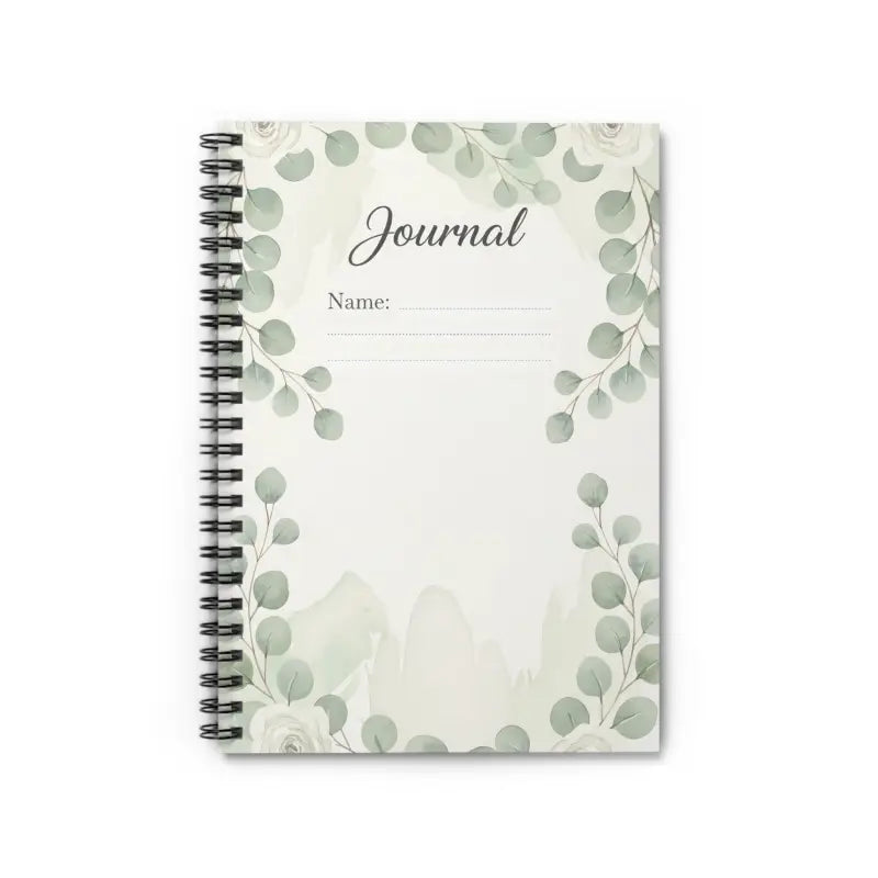 Soft watercolor eucalyptus leaves dance across the cover alongside delicate cream florals, creating a serene backdrop for your personal journaling journey. The ruled lines keep your handwriting neat and organized while the durable metal spiral binding lets you fold pages completely back for comfortable one-handed writing anywhere inspiration strikes.