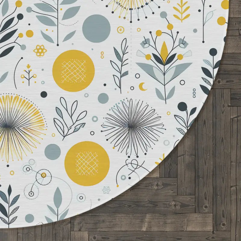 Imagine coming home to a space that instantly makes you smile. Our botanical round rug is all about combining stunning aesthetics and unbeatable functionality. It’s crafted to give you not only a pop of color but also a cozy, inviting atmosphere that makes your home the perfect haven. Its dynamic design is inspired by nature, with floral motifs dancing subtly against a chic grey background and lively yellow accents that bring warmth and vibrancy every day.