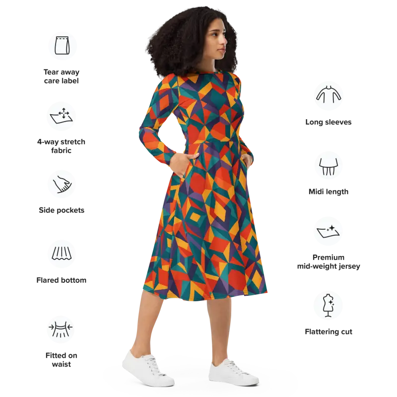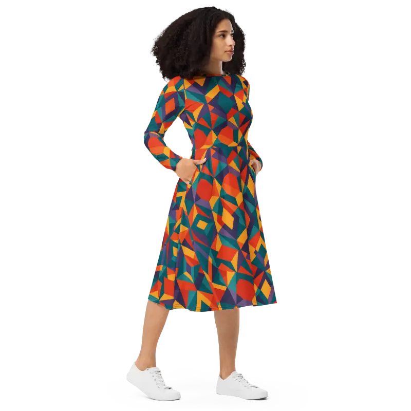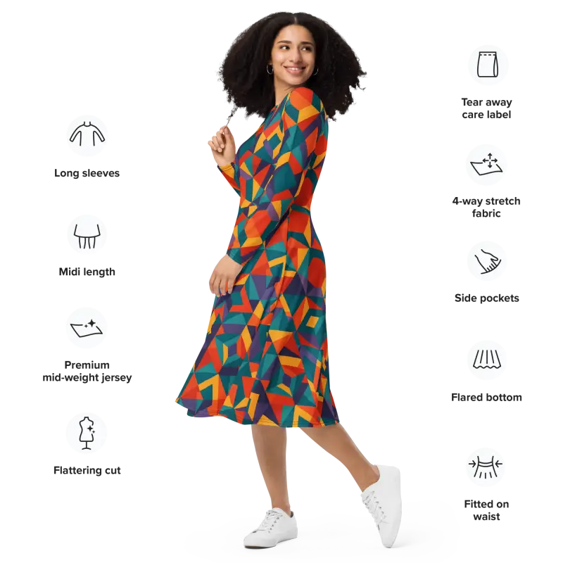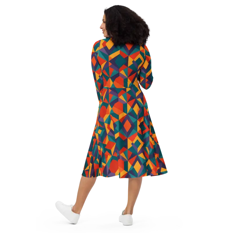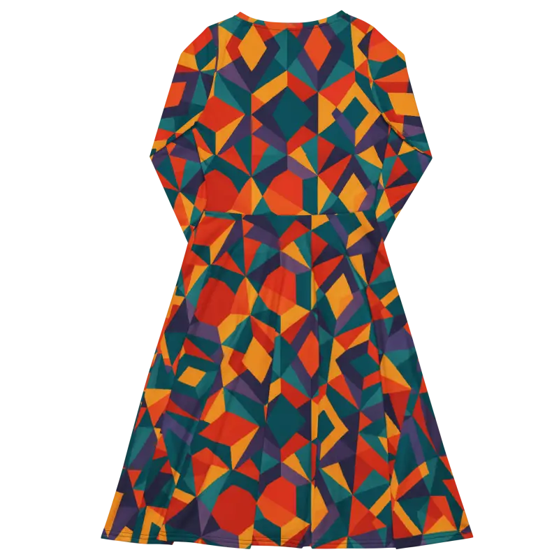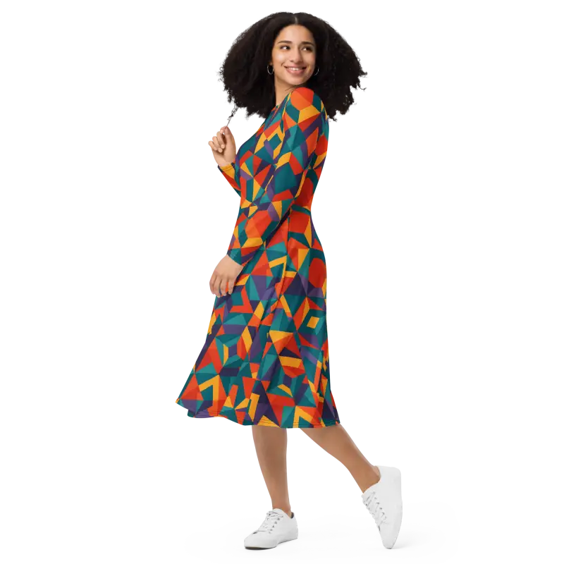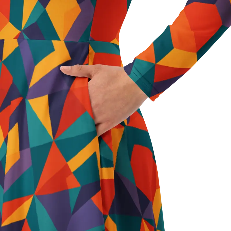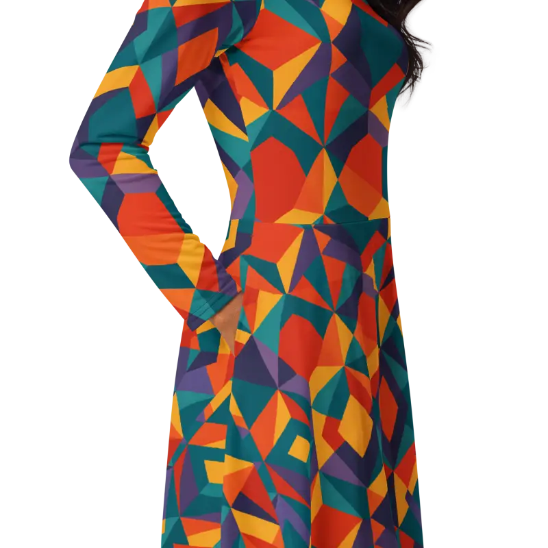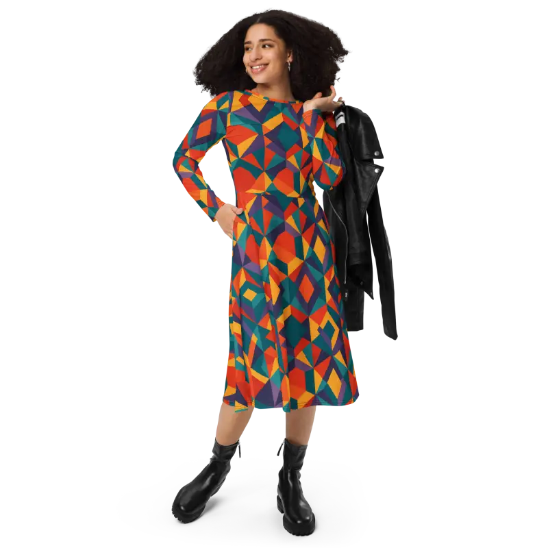 Feel the buzz of bold color and shape as you slip into this bright geometric pattern long sleeve midi dress—imagine walking into a sunlit loft or a cozy café, the artful print catching every eye and hugging your curves in all the right places.