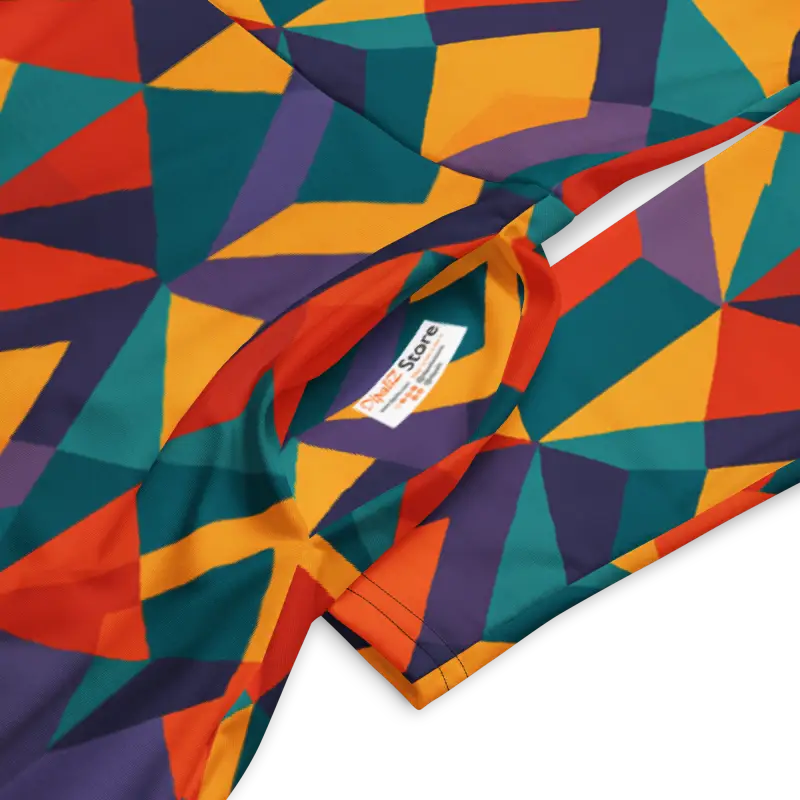 A dynamic mix of triangles, diamonds, and abstract stripes in emerald, coral, navy, and mustard for a head-turning, modern graphic look.
